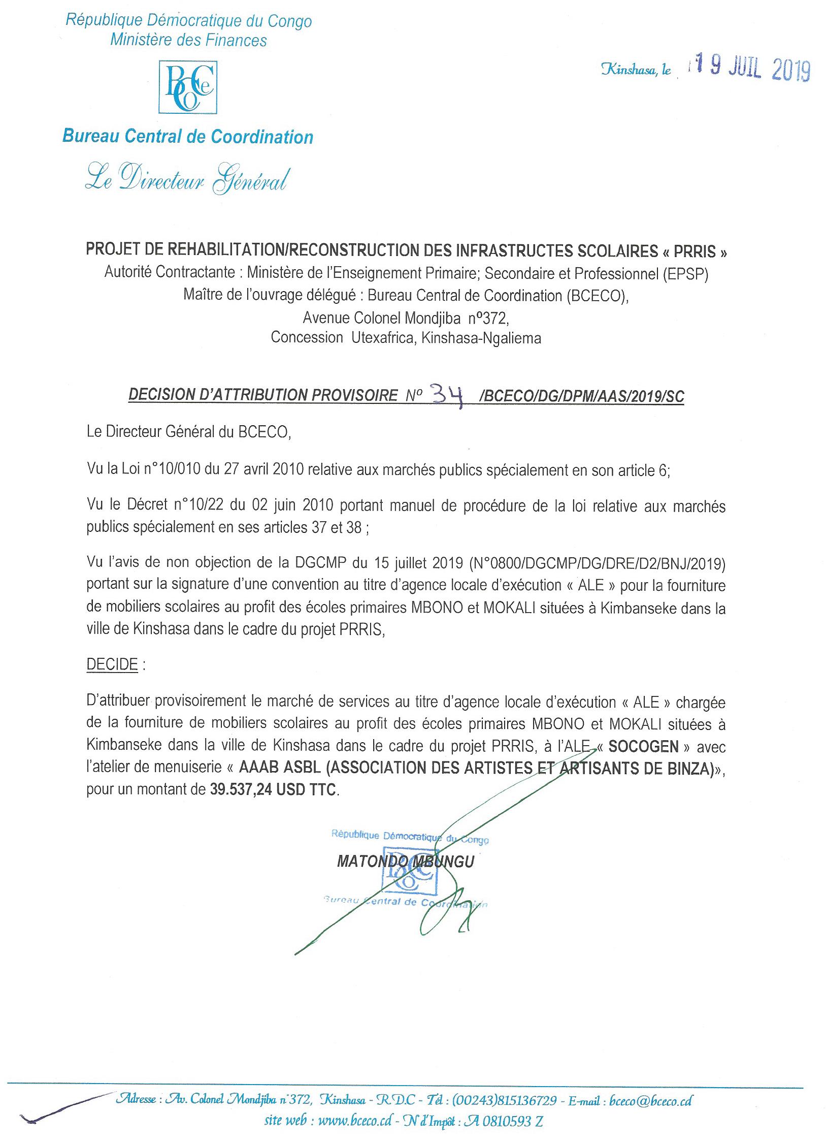 Attribution provisoire du marché de fourniture de mobiliers scolaires au profit des écoles primaires mbono et mokali situées à kimbanseke dans la ville de Kinshasa à l’ale « SOCOGEN.