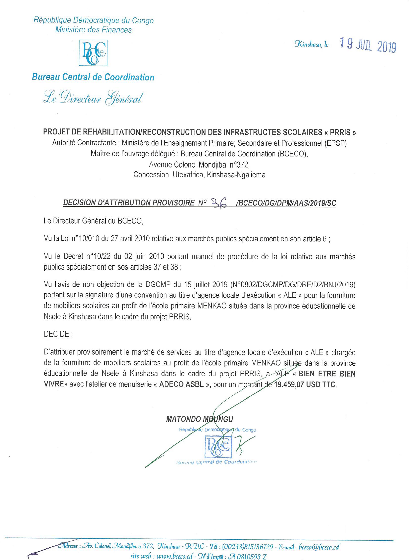 Attribution provisoire du marché de fourniture de mobiliers scolaires au profit des écoles primaires menkao situées dans la province éducationnelle de nsele à Kinshasa à l’ale « bien être bien vivre avec la menuiserie « ADECO ASBL».