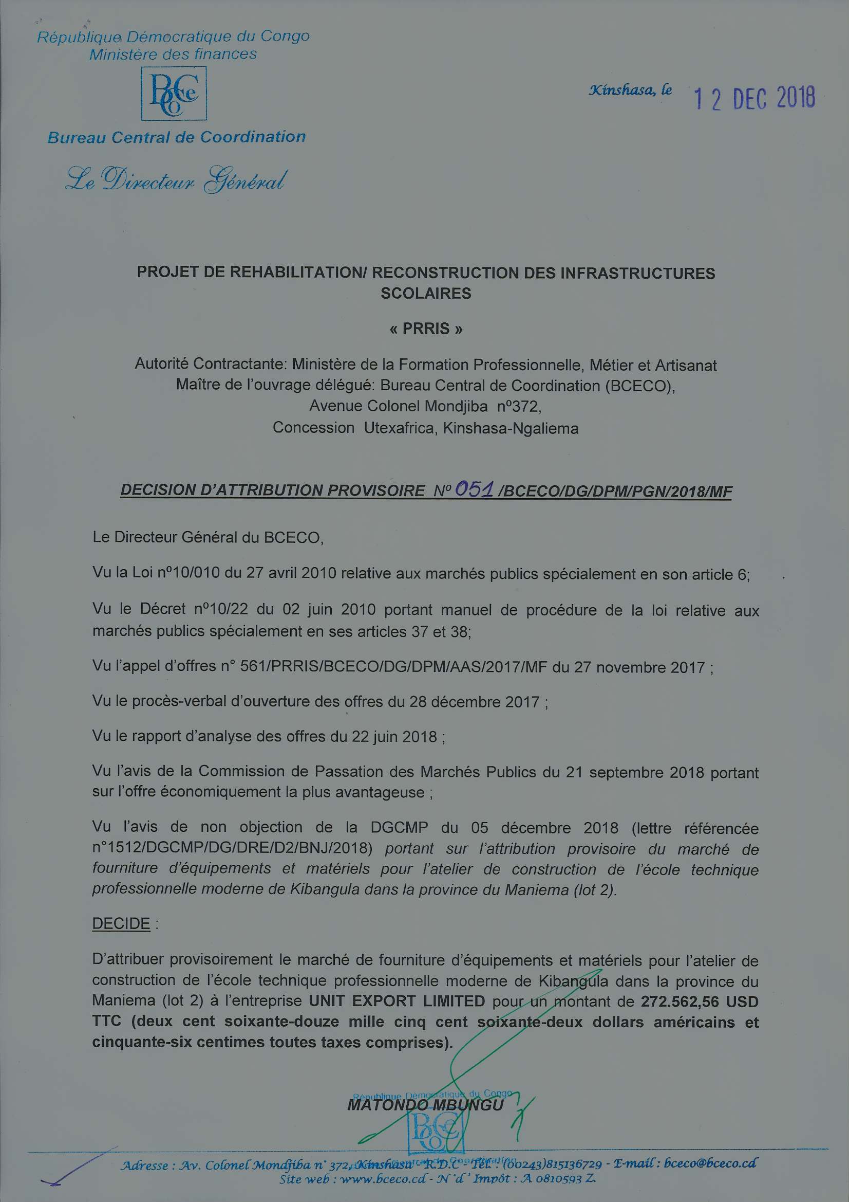 Attribution provisoire du marché de fourniture d’équipements et matériels pour l’atelier de construction de l’école technique professionnelle moderne de kibangula dans la province du Maniema (lot 2) à l’entreprise unit export limited.