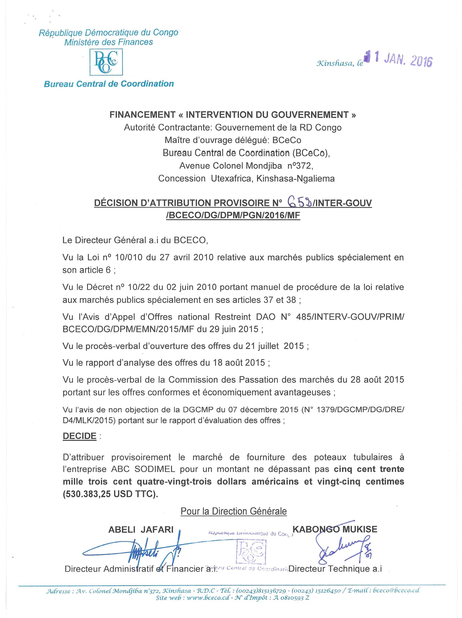 Attribution provisoire du marché de fourniture des poteaux tubulaires à L’ENTREPRISE ABC SODIMEL.