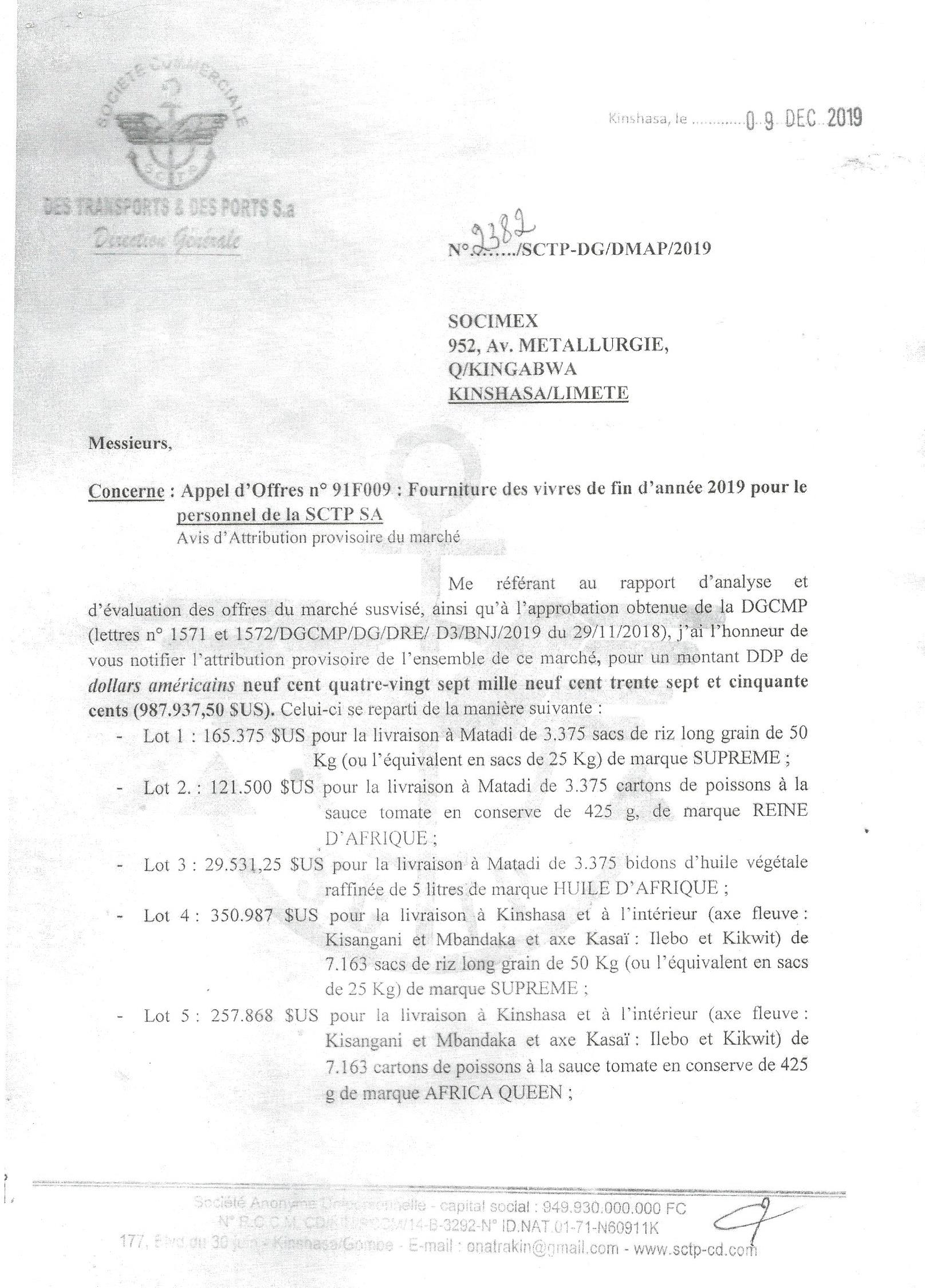 Attribution provisoire du marché de fourniture des vivres de fin d’année 2019 pour le personnel de la SCTP sa, à la société SOCIMEX.