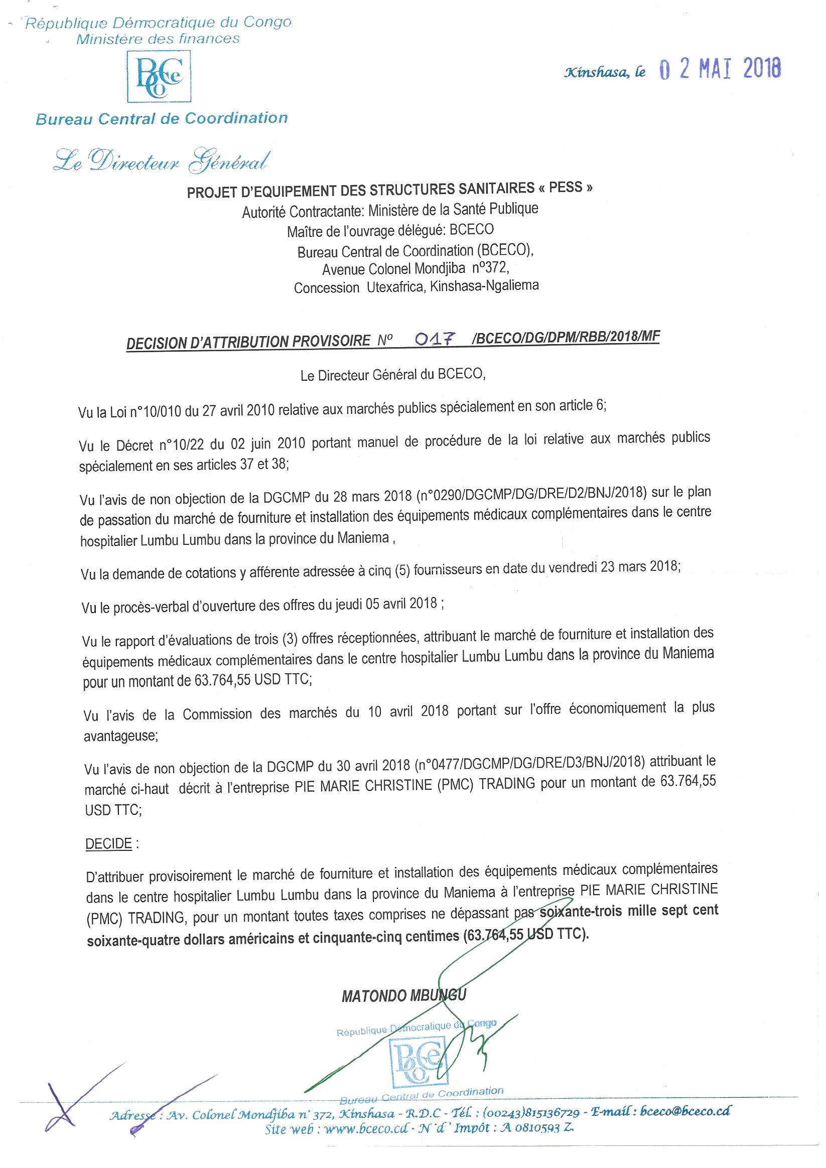 Attribution provisoire du marché de fourniture et installation des équipements médicaux complémentaires dans le centre hospitalier lumbu lumbu dans la province du Maniema à l’entreprise PIE MARIE CHRISTINE.