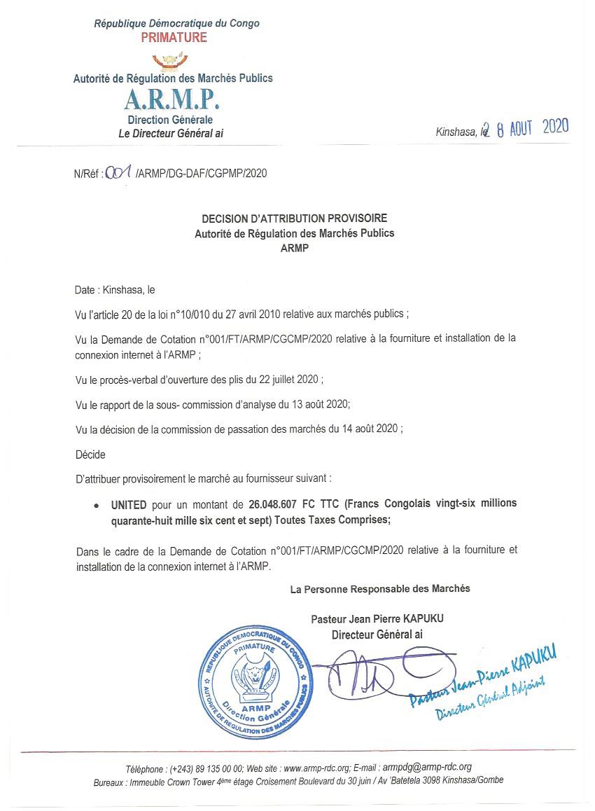 Attribution provisoire du marché de fourniture relatif à la fourniture et installation de la connexion internet a la société United