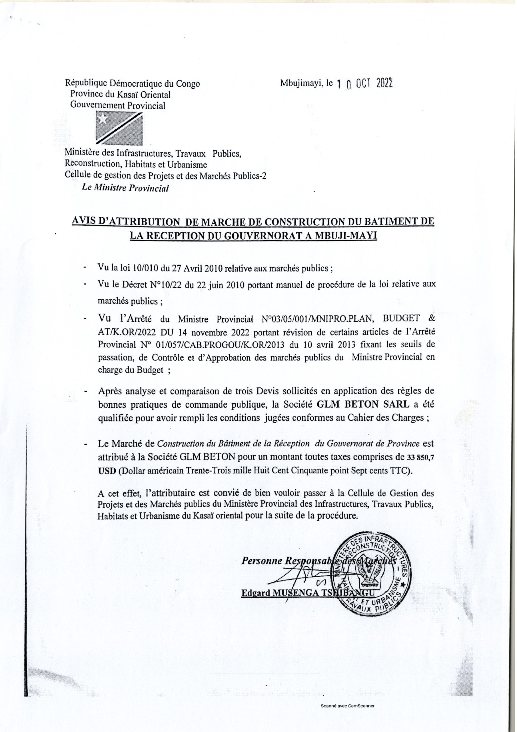 Attribution provisoire du marché de la Province du KASAI-ORIENTAL accordée à la Société GLM BETON SARL relative à la construction du bâtiment de la réception du Gouvernorat à Mbuji-Mayi.