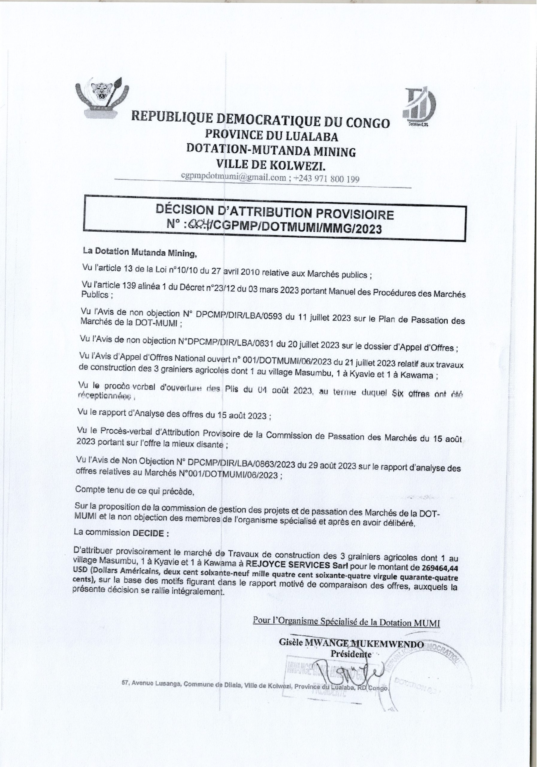 Attribution Provisoire du marché  de Travaux de Construction des 3 grainiers agricoles dont 1 au village Masumbu, 1 à Kyavie et 1 Kawama à REJOYCE SERVICES Sarl