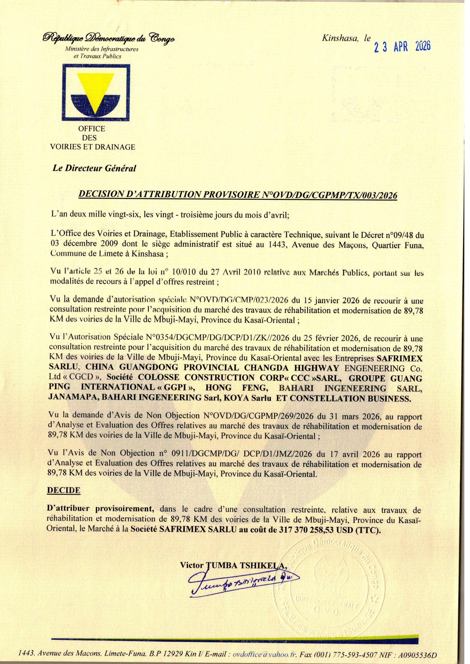 Attribution Provisoire du marché de  travaux de réhabilitation et modernisation de 89,78 KM des voiries de la Ville de Mbuji-Mayi, Province du Kasaï-Oriental à la Société SAFRIMEX SARLU