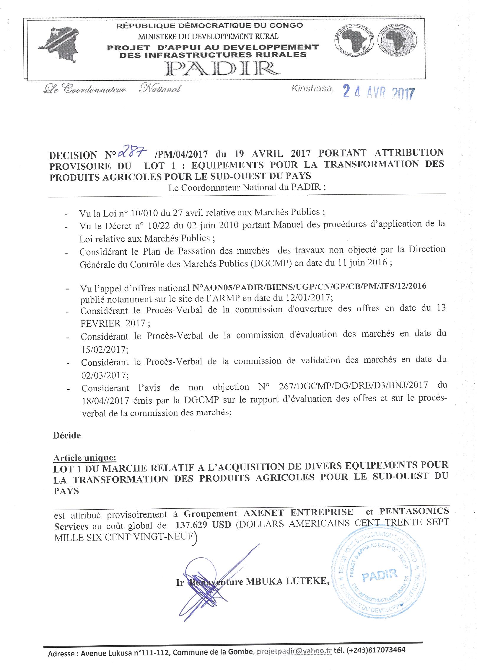 Attribution provisoire du marché d’équipements pour la transformation des produits agricoles pour sud-ouest du pays à groupement axenet entreprise et pentasonics services. Lot 1