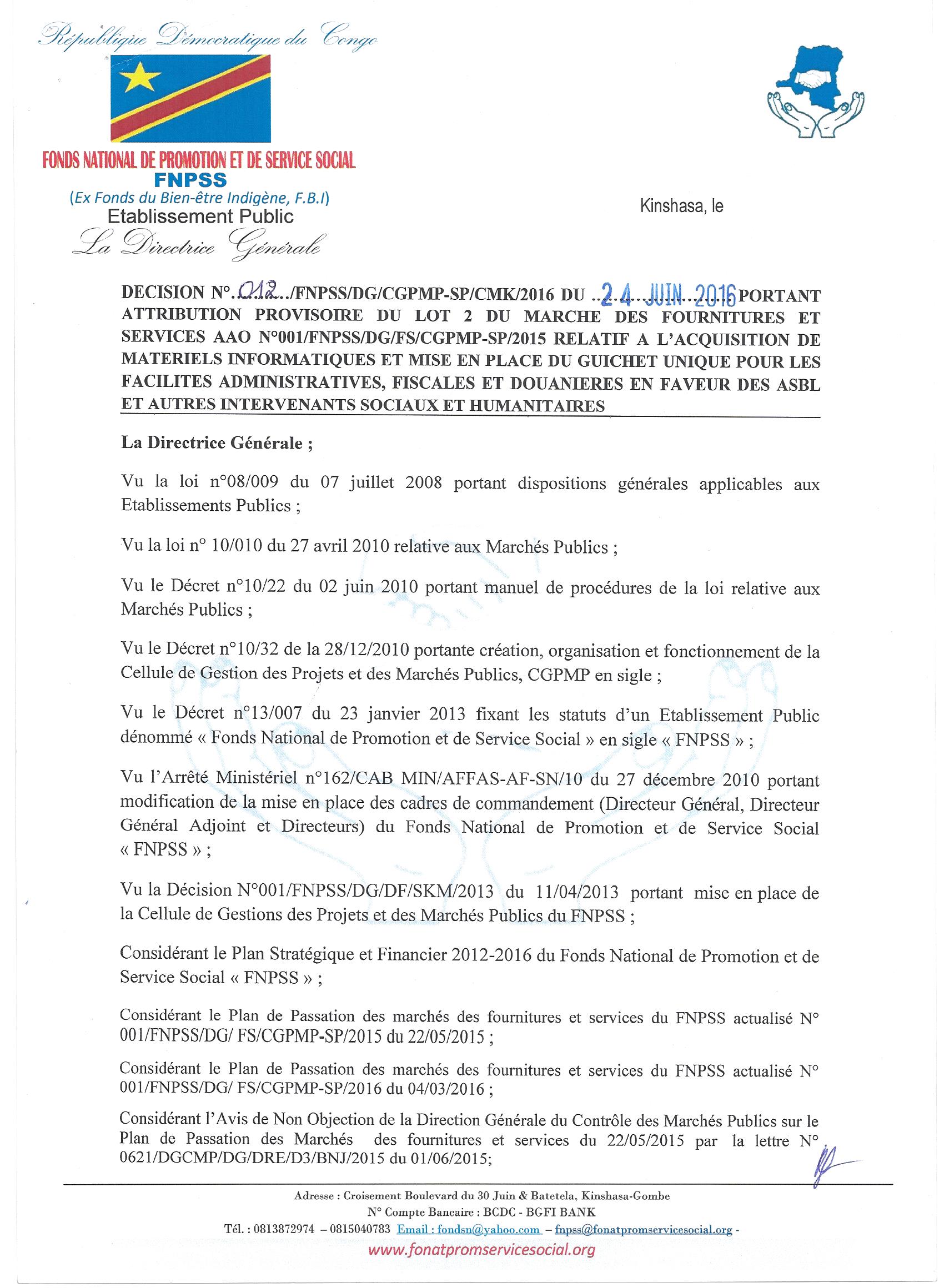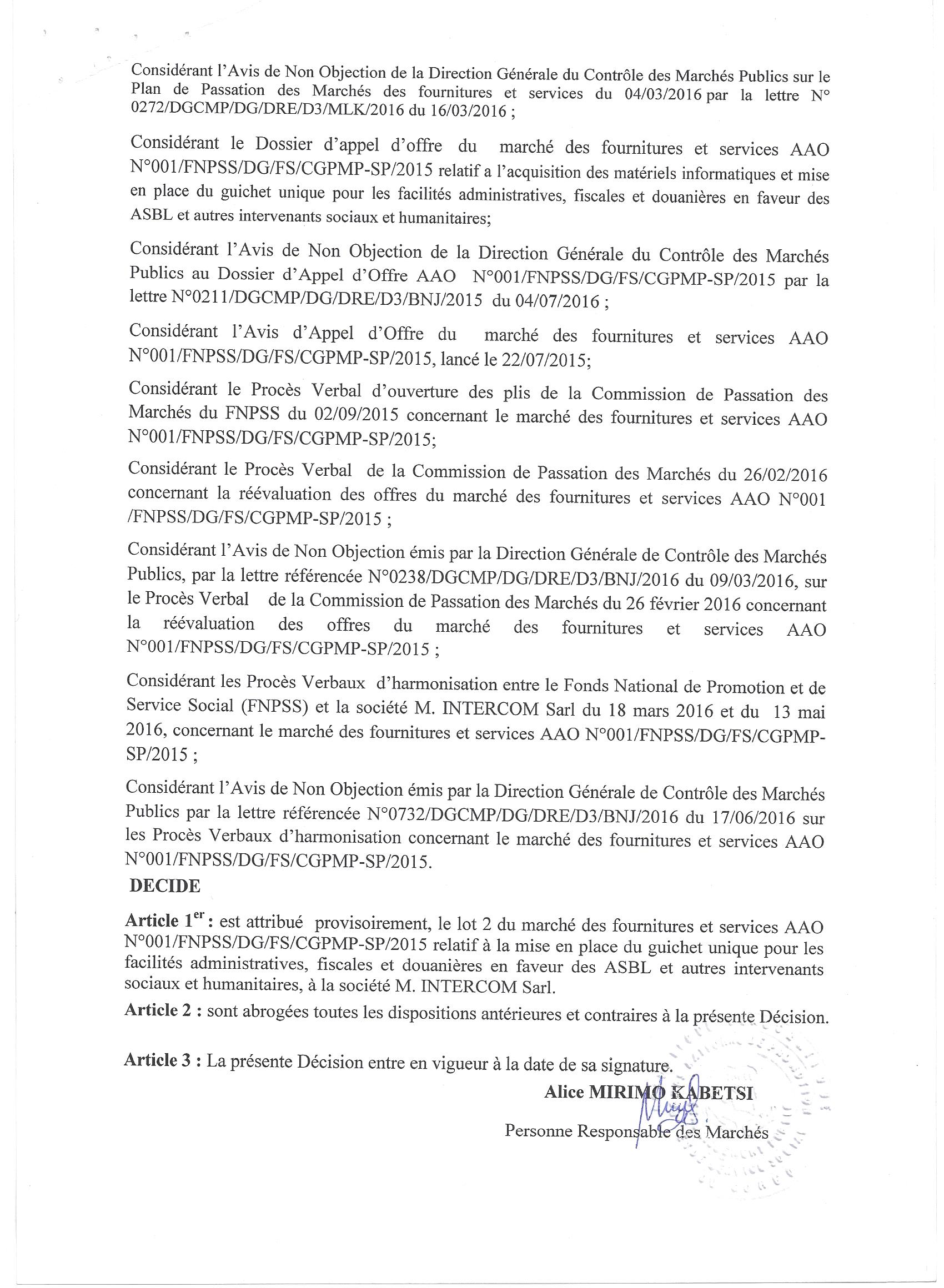 Attribution provisoire du marché des fournitures et services relatif à l’acquisition de matériels informatiques et mise en place du guichet unique pour les facilites administratives, fiscales et douanières en faveur des asbl et autres intervenants sociaux