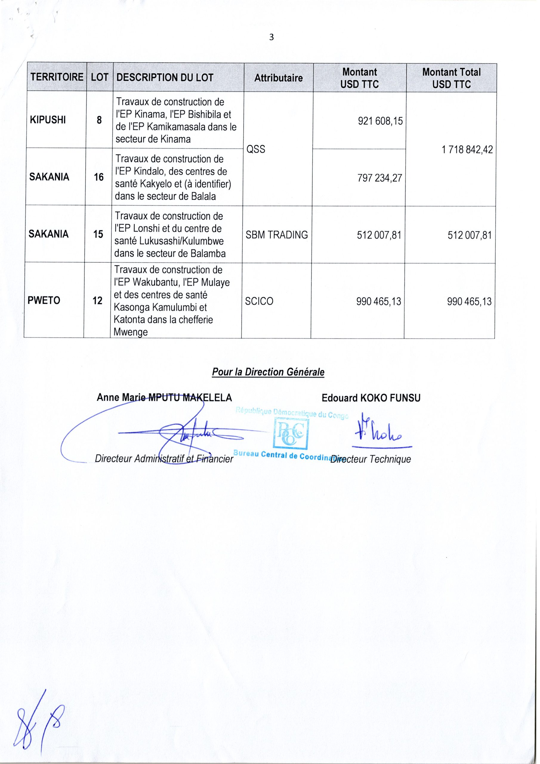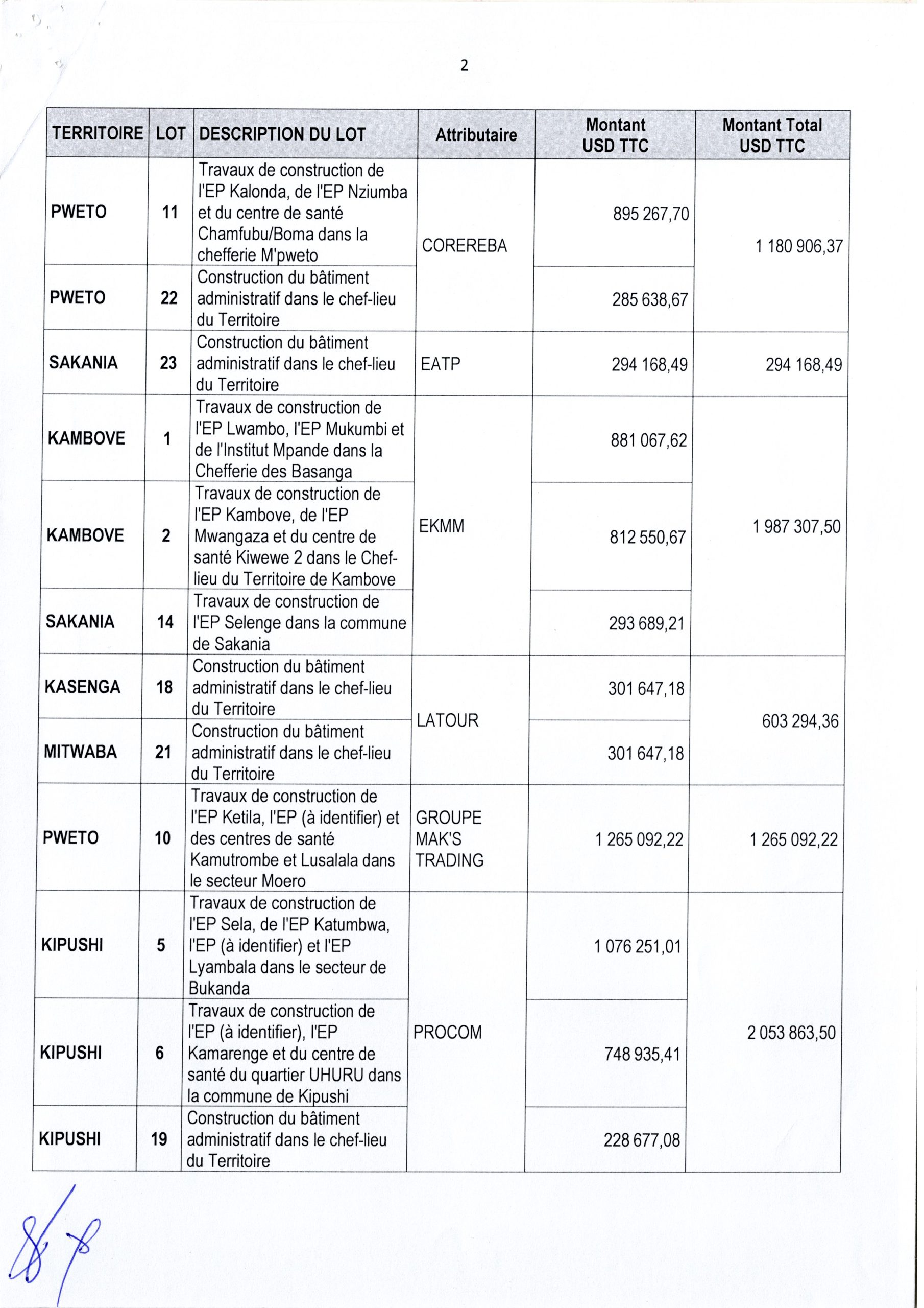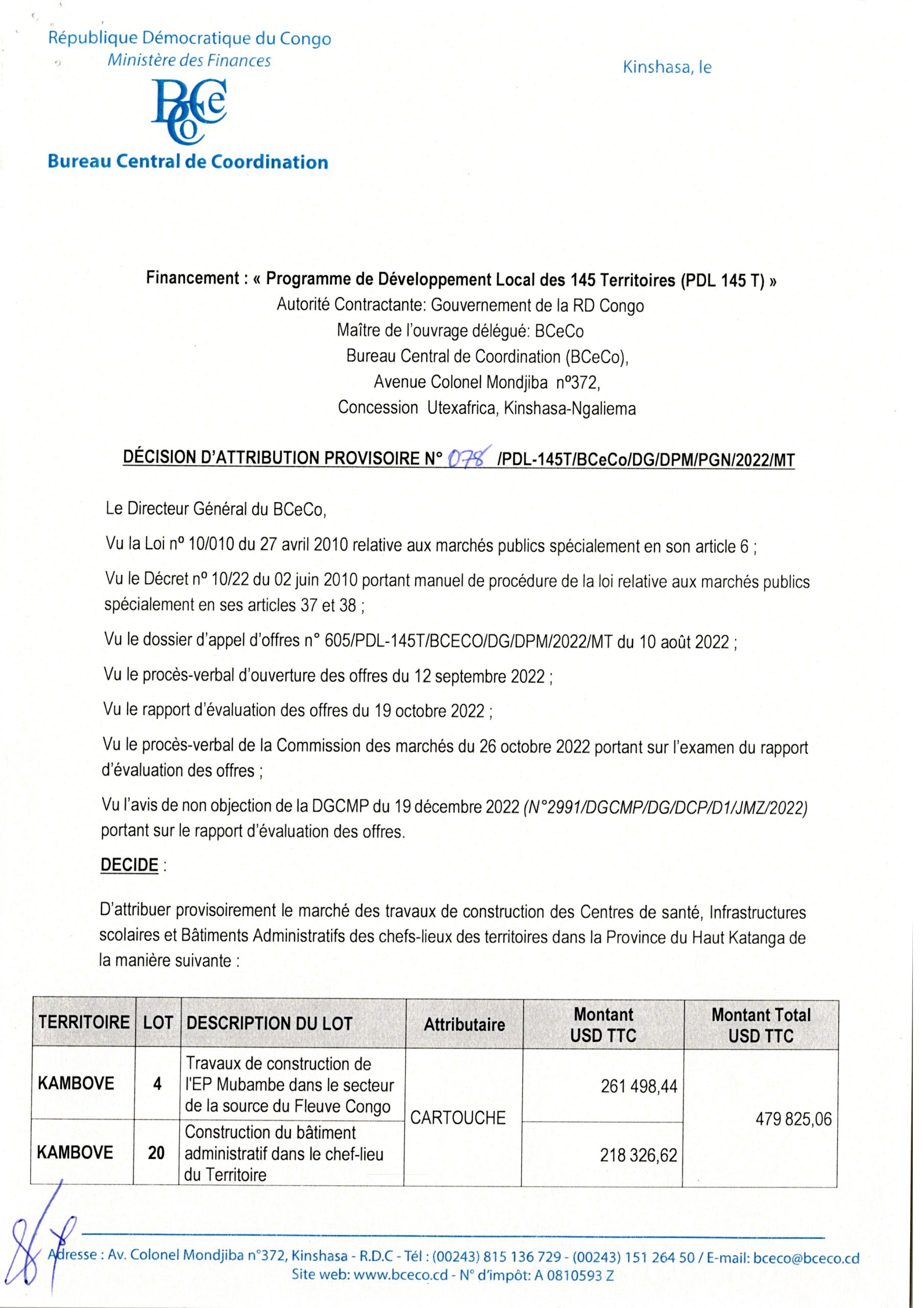 Attribution Provisoire du marché des travaux de construction des Centres de santé, Infrastructures scolaires et Bâtiments Administratifs des chefs-lieux des territoires dans la Province du Haut Katanga,…