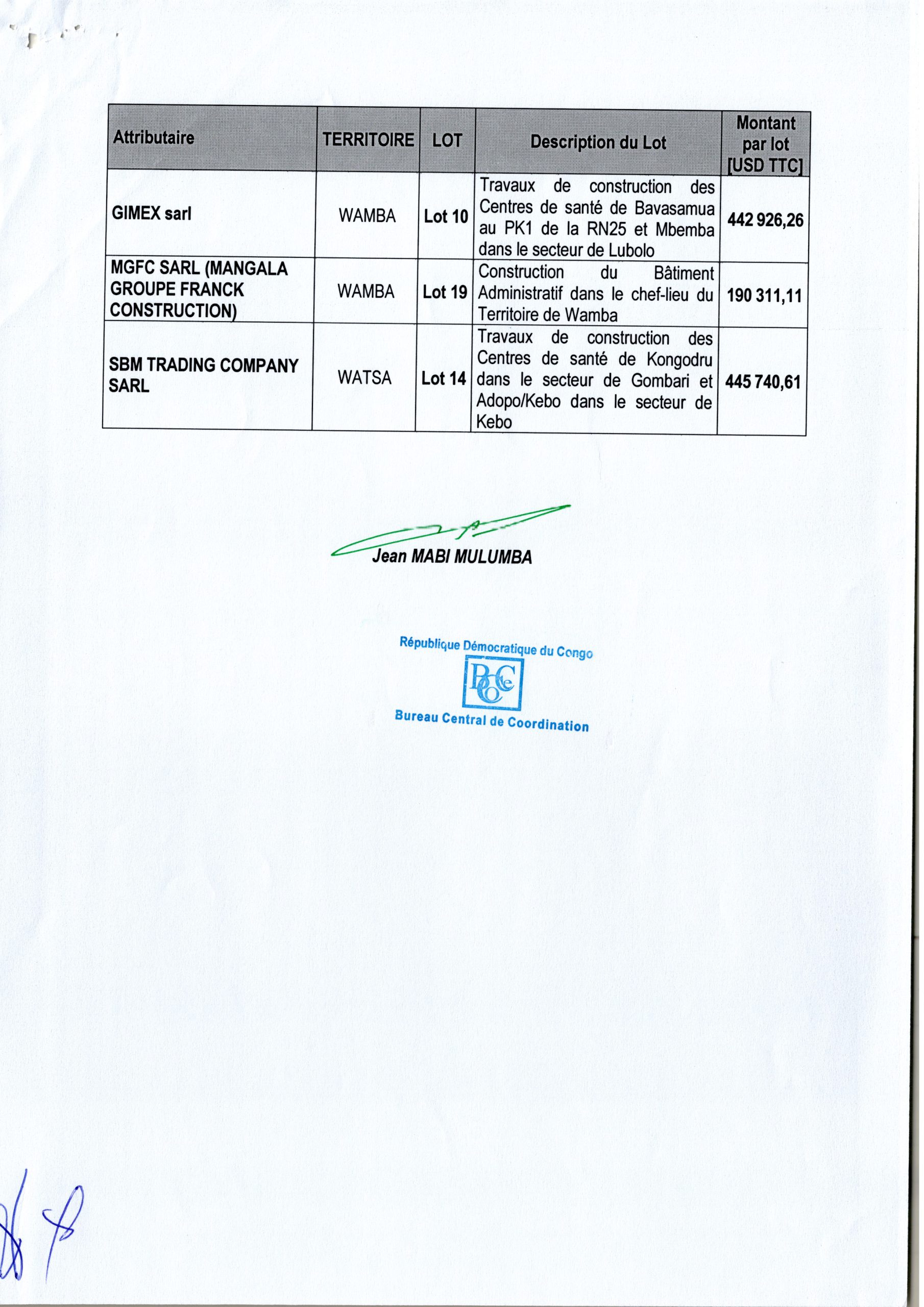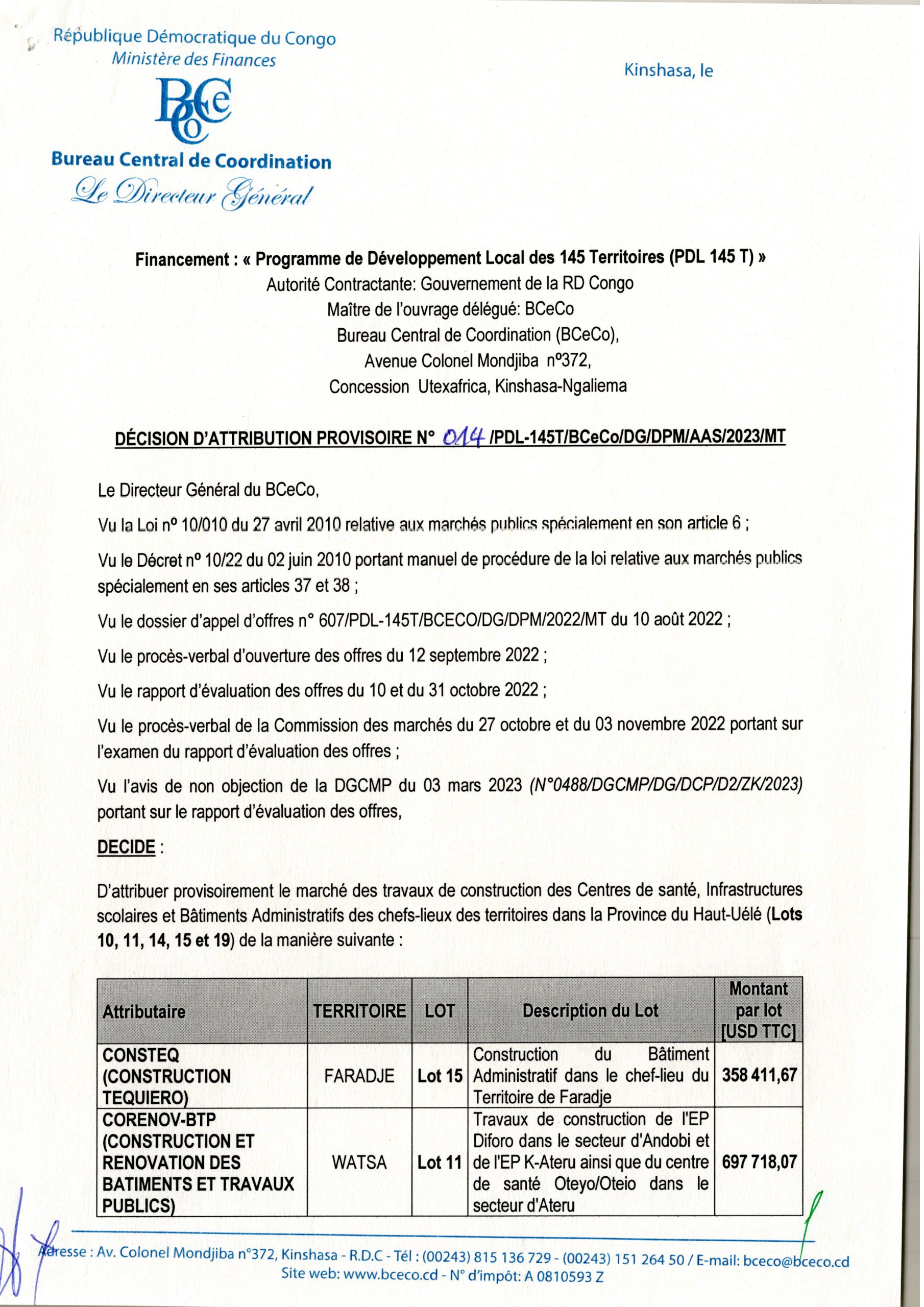 Attribution Provisoire du marché des travaux de construction des Centres de santé, Infrastructures Scolaires et Bâtiments Administratifs des chefs-lieux des territoires dans la Province du Haut-Uélé (lots 10,11,14,15 et 19,…