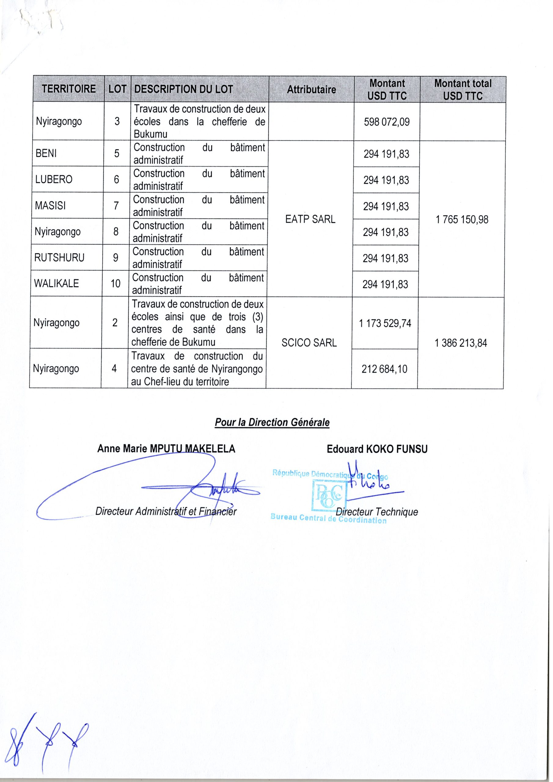 Attribution Provisoire du marché des travaux de construction des Centres de santé, Infrastructures scolaires et Bâtiments Administratifs des chefs-lieux des territoires dans la Province du Nord-Kivu