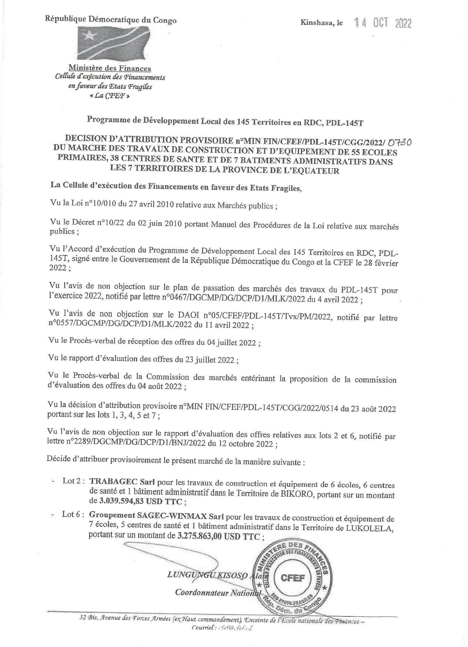 Attribution Provisoire du marché des travaux de construction et d’Equipement de 55 Ecoles Primaires, 38 Centres de santé et de 7 Bâtiments Administratifs dans les 7 Territoires de la Province de l’Equateur aux sociétés : TRABAGEC Sarl et Groupement SAGEC-