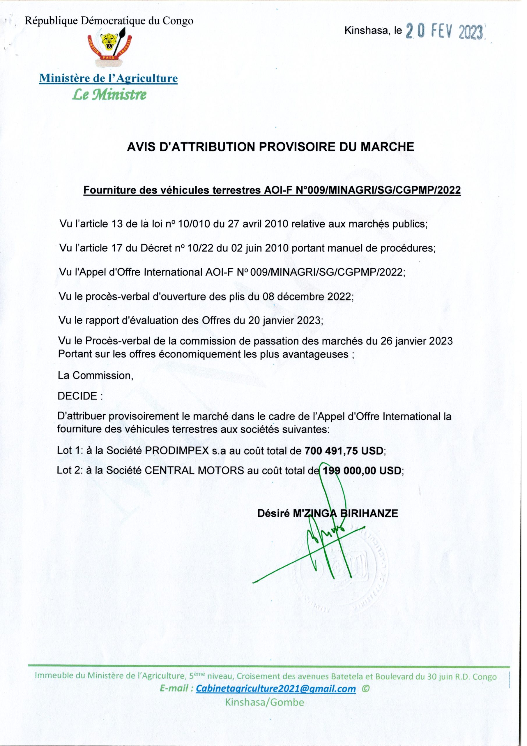Attribution provisoire du marché du ministère de l’Agriculture relative au marché de fourniture des véhicules terrestres du ministère de l’Agriculture accordée à : Lot 1 : à la société PRODIMPEX et lot 2 : à la société Central Motors.