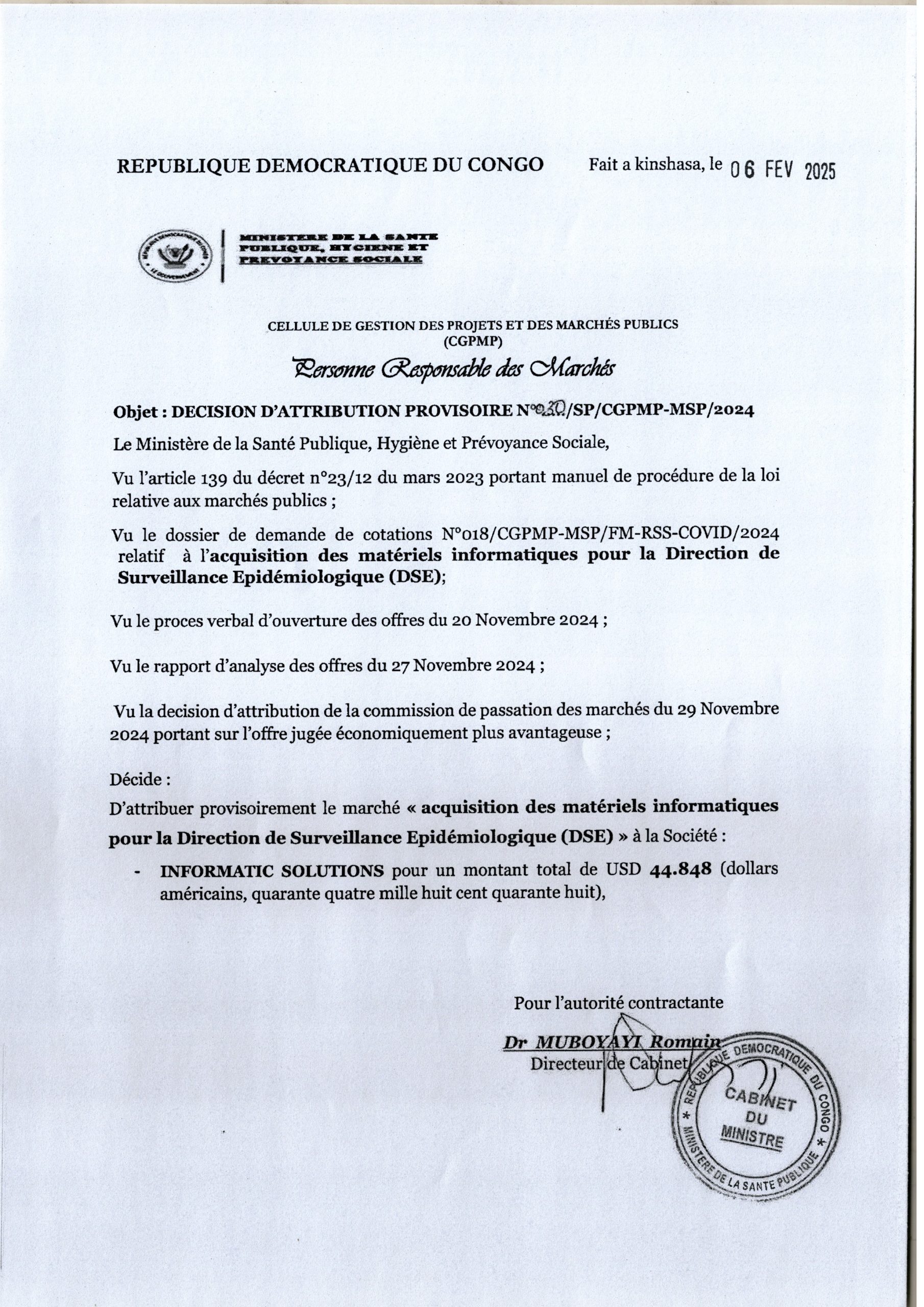 Attribution Provisoire du marché pour l’Acquisition des matériels informatiques pour la Direction de Surveillance Epidémiologique (DES) à la Société : INFORMATIC SOLUTIONS