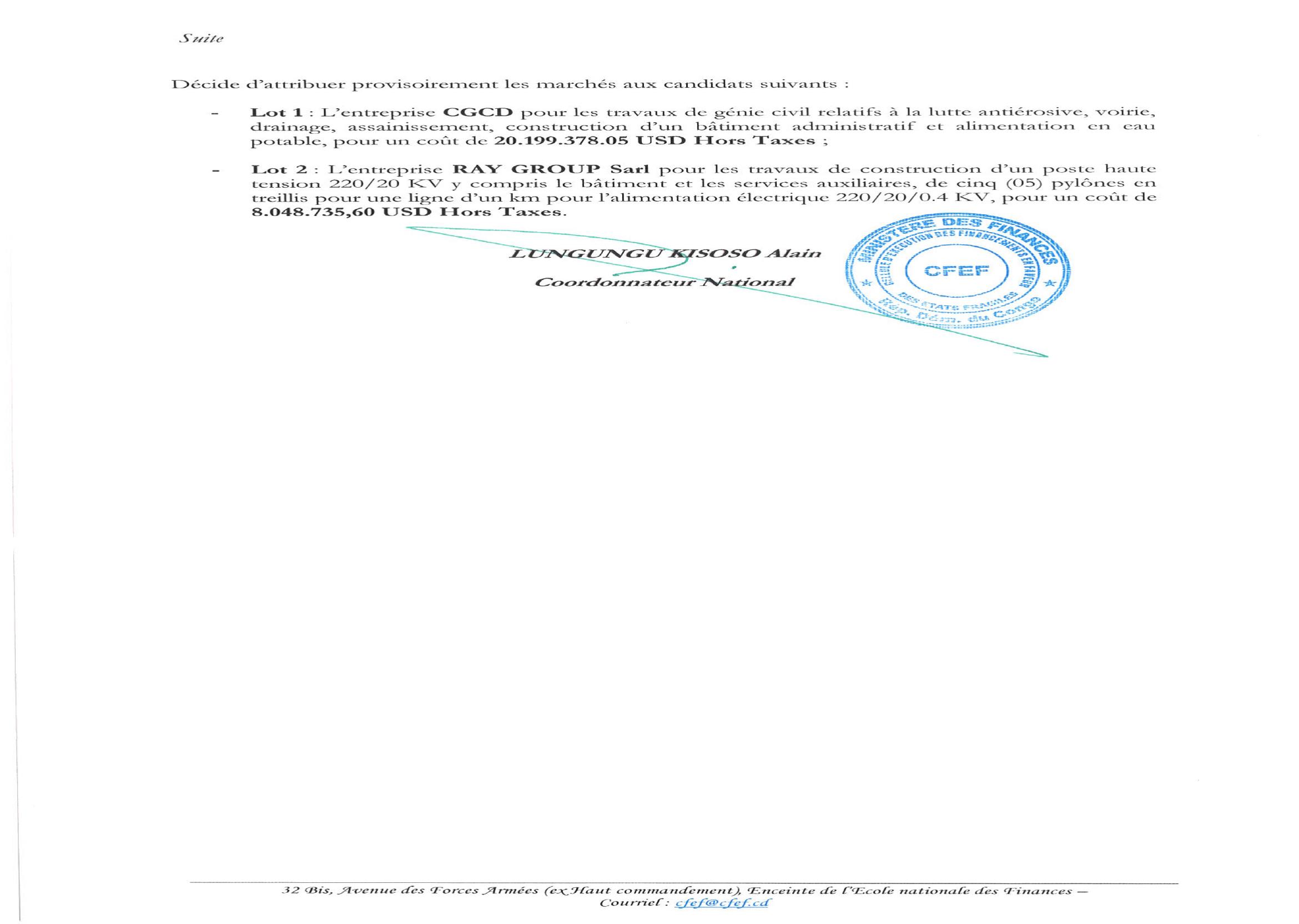 Attribution Provisoire du marché relatif à la construction du bâtiment administratif et alimentation en l’eau potable (lot 1) et construction d’un poste haute tension 220/20 KV y compris le bâtiment et les services auxiliaires ;… (lot2).