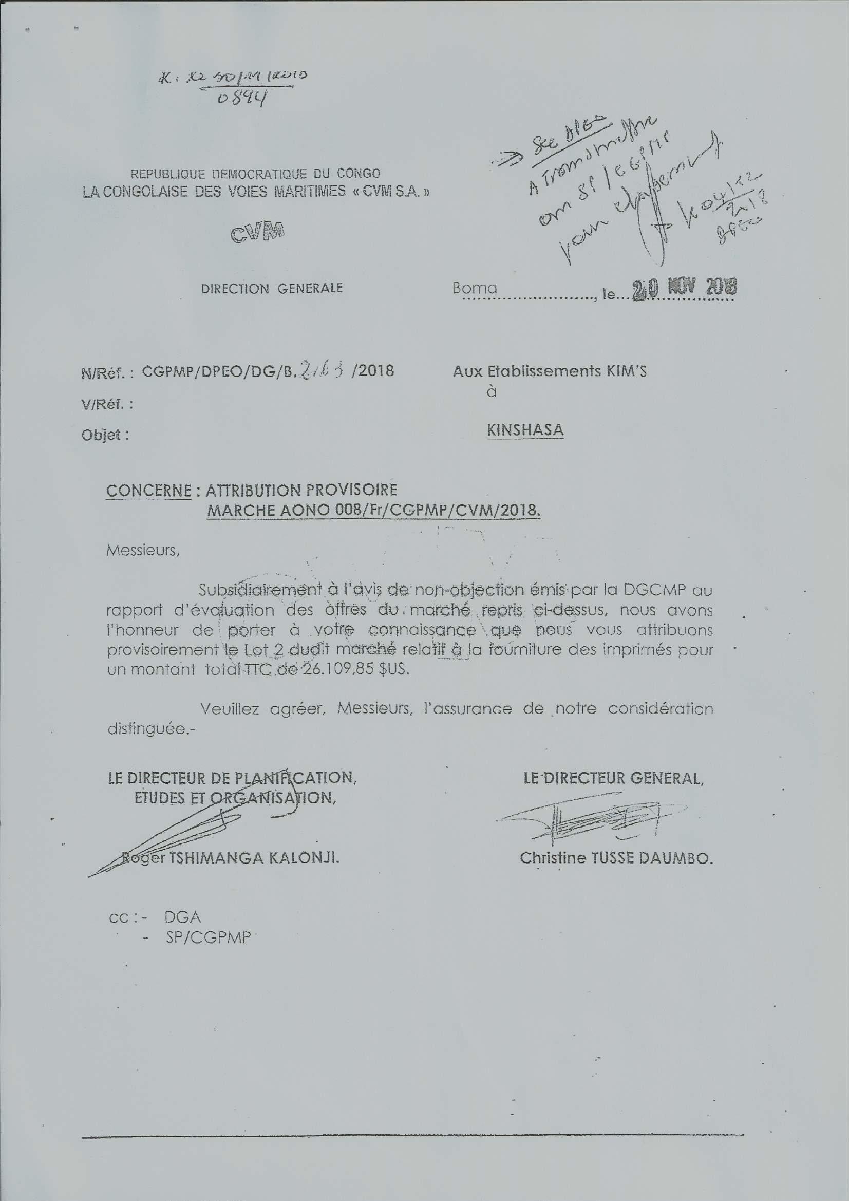 Attribution provisoire du marché relatif à la fourniture des imprimés aux établissements KIM’S.