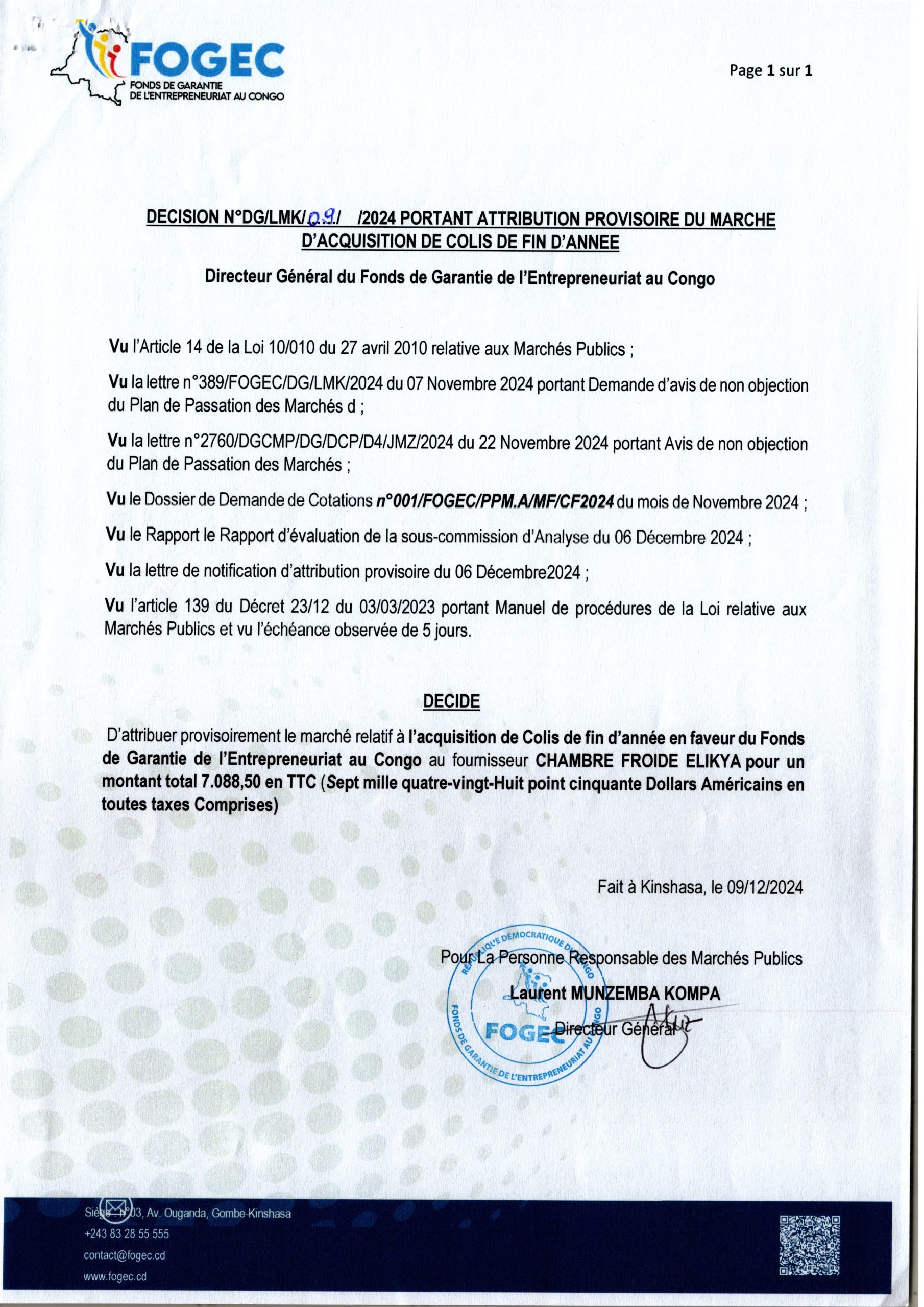 Attribution Provisoire du Marché relatif à l’Acquisition de Colis de Fin d’Année en faveur du Fonds de Garantie de l’Entrepreneuriat au Congo au Fournisseur CHAMBRE FROIDE ELIKYA