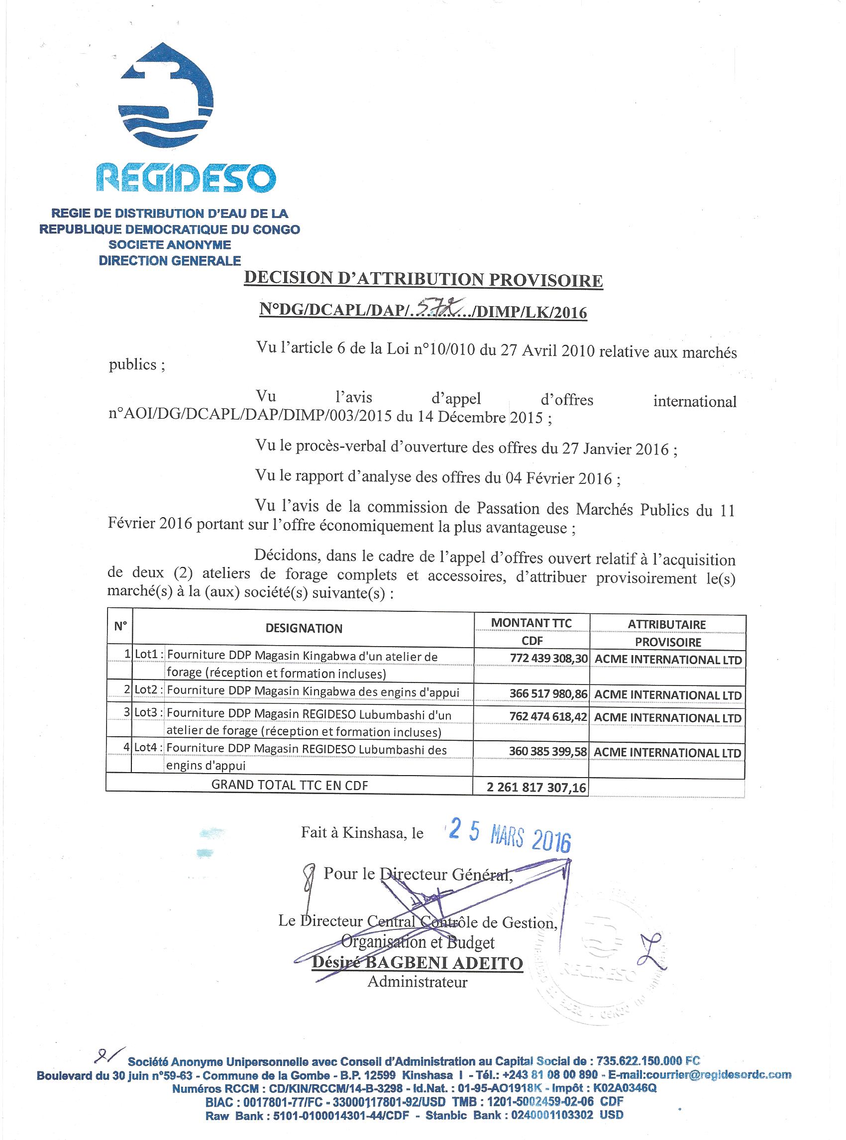 Attribution provisoire du marché relatif à l’acquisition de deux ateliers de forage complets et accessoires à LA SOCIÉTÉ ACME INTERNATIONAL LTD.
