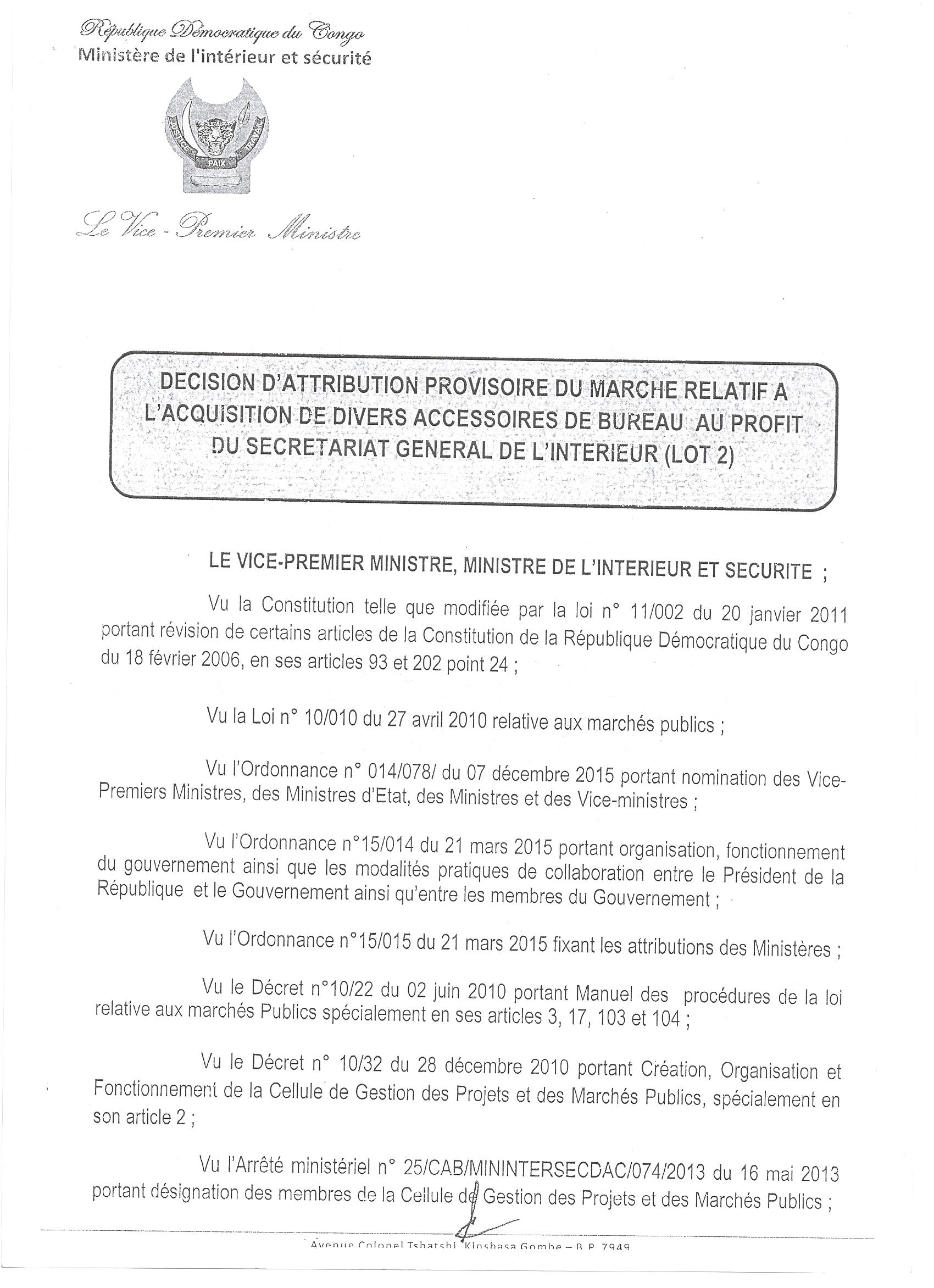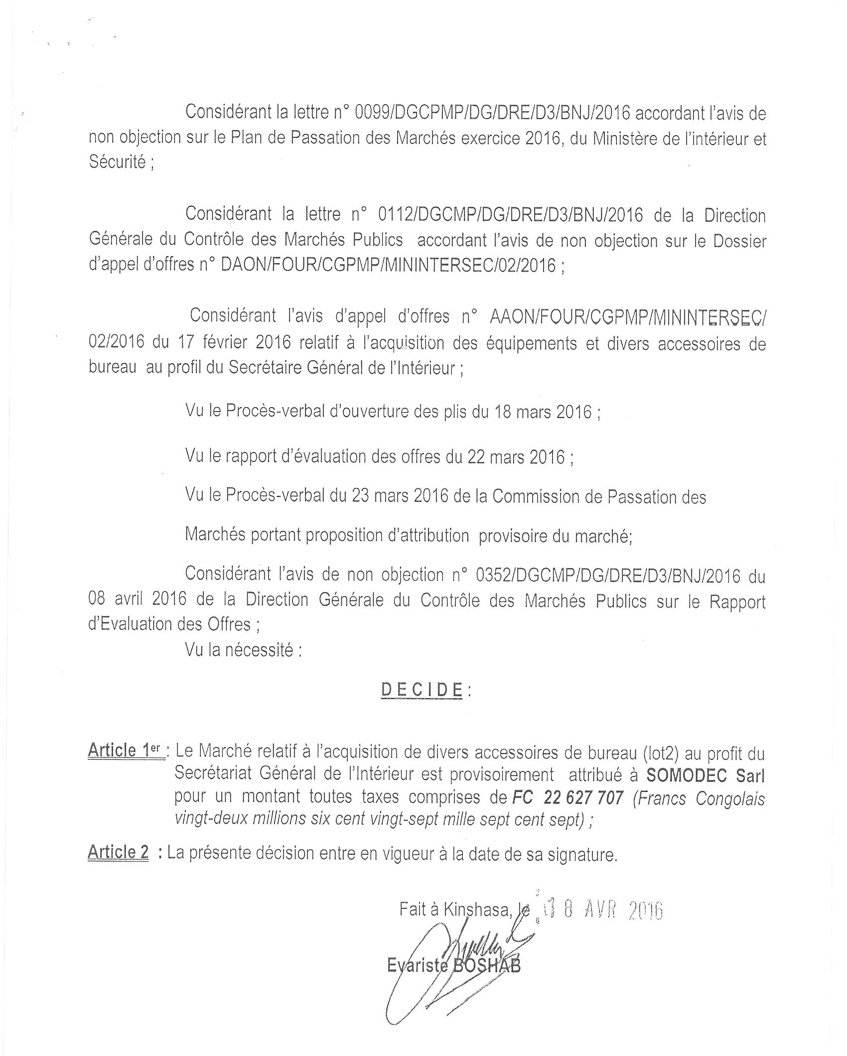 Attribution provisoire du marché relatif à l’acquisition de divers accessoires de bureau au profit du secrétariat général de l’intérieur (LOT 2).