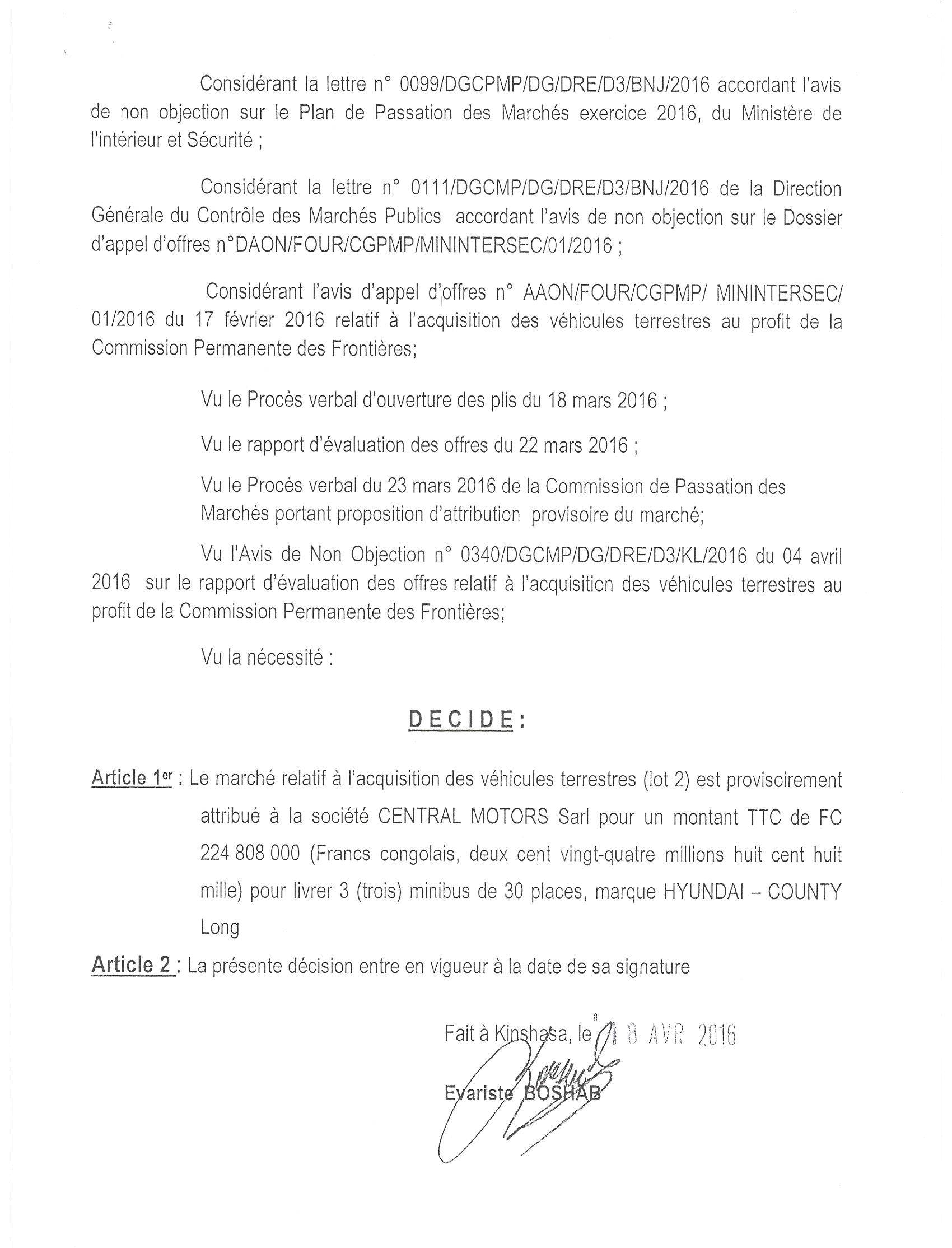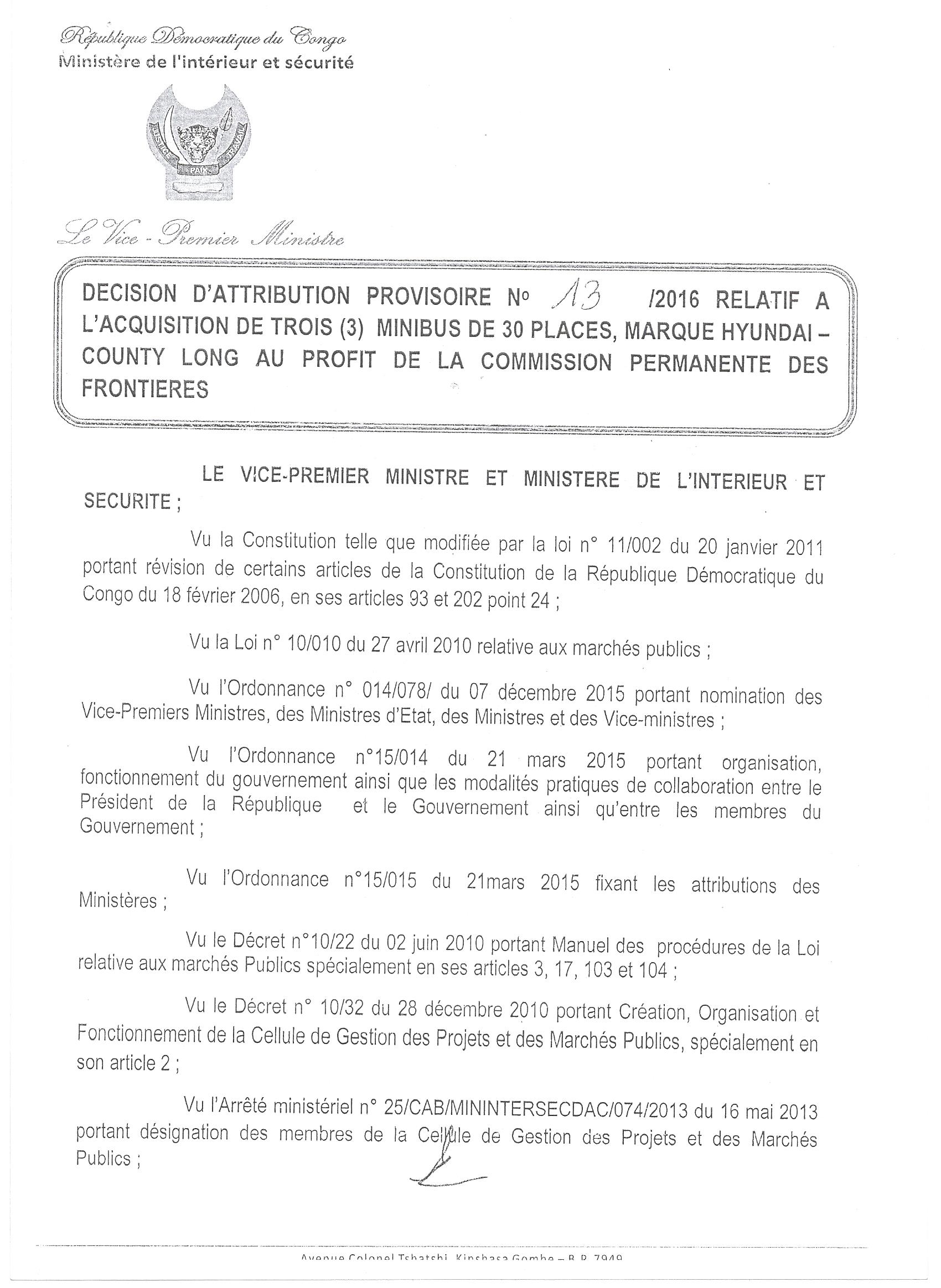 Attribution provisoire du marché relatif à l’acquisition de trois (3) minibus de 30 places, marque hyundai-county long à SOCIÉTÉ CENTRAL MOTORS SARL.