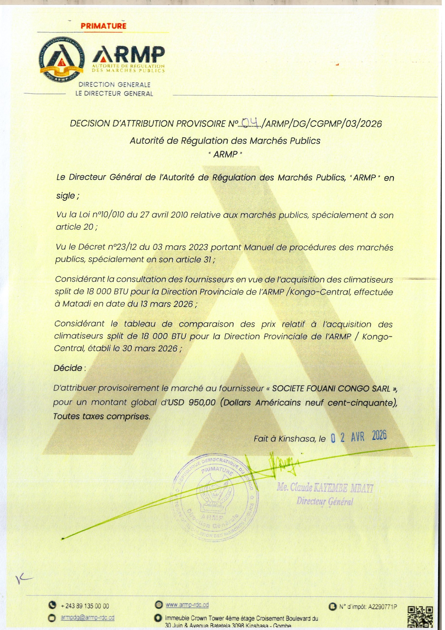 Attribution Provisoire du marché relatif à l’acquisition des climatiseurs split de 18 000 BTU pour la Direction Provinciale de l’ARMP/Kongo-Central, au fournisseur « SOCIETE FOUANI CONGO SARL »