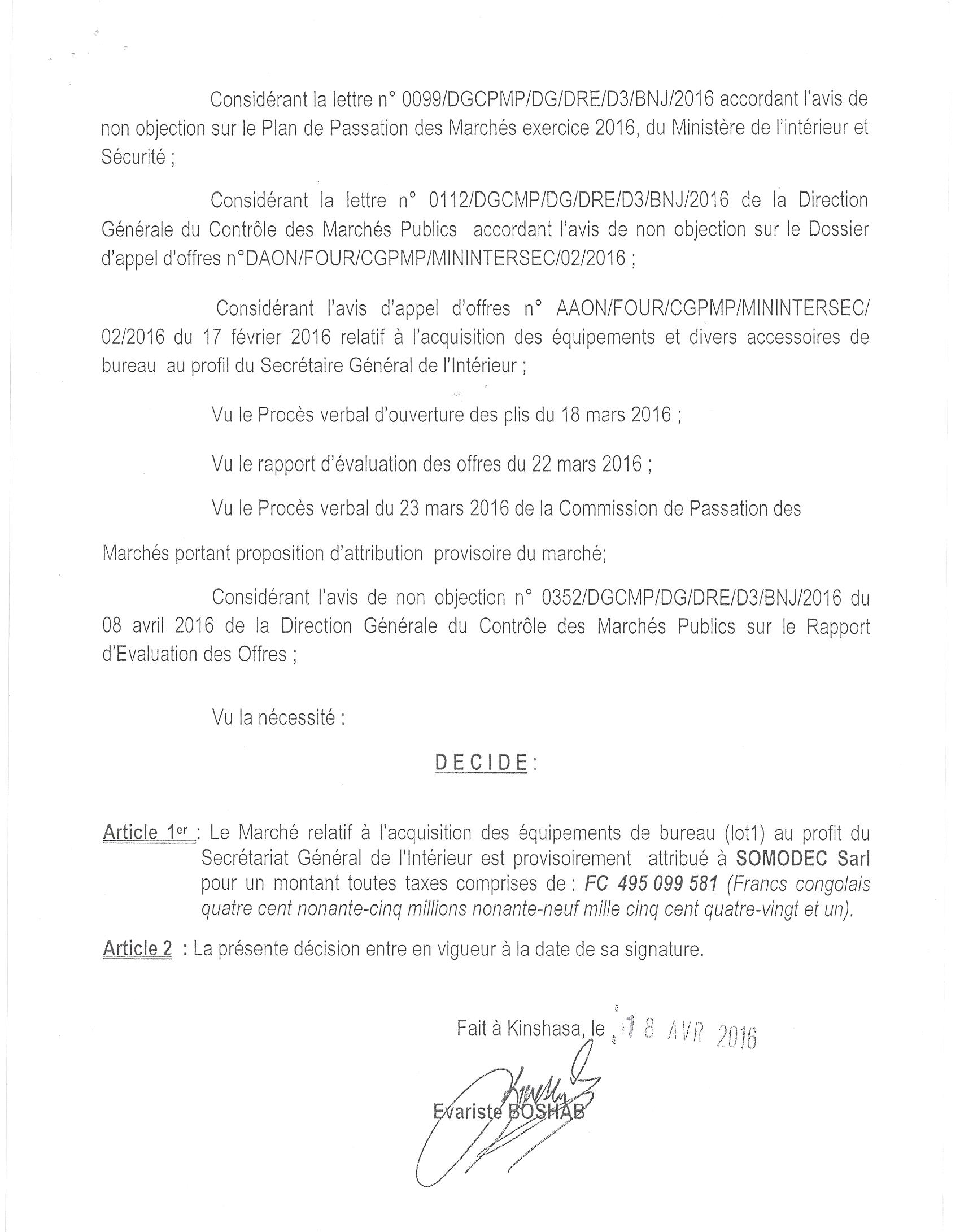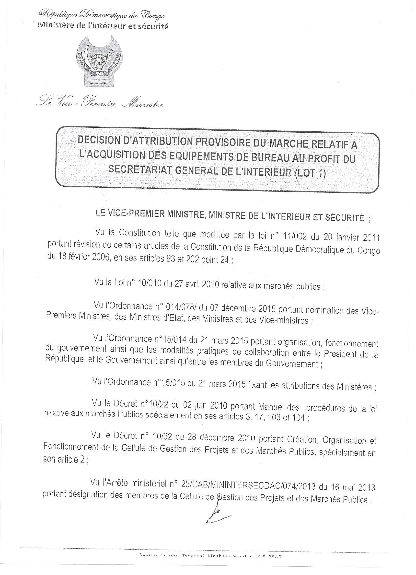Attribution provisoire du marché relatif à l’acquisition des équipements de bureau au profit du secrétariat général de l’intérieur (LOT 1).