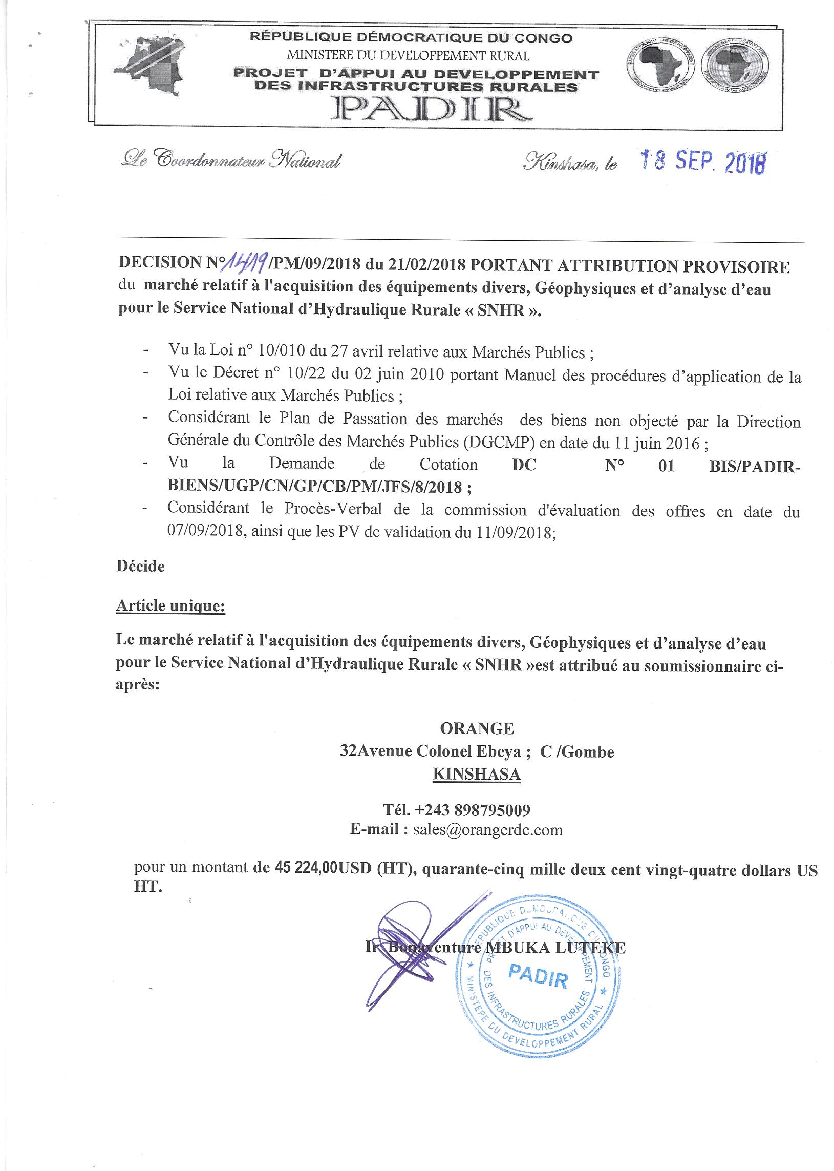 Attribution provisoire du marché relatif à l’acquisition des équipements divers, géophysiques et d’analyse d’eau pour le service national d’hydraulique rural à orange.