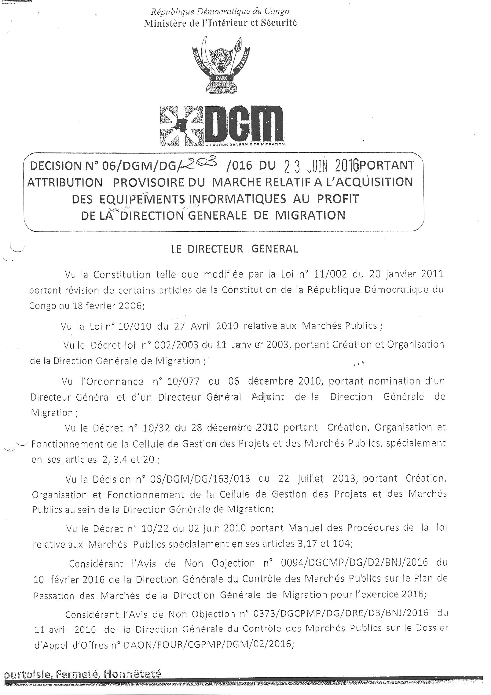 Attribution provisoire du marché relatif à l’acquisition des équipements informatiques au profit de LA DIRECTION GÉNÉRALE DE MIGRATION.
