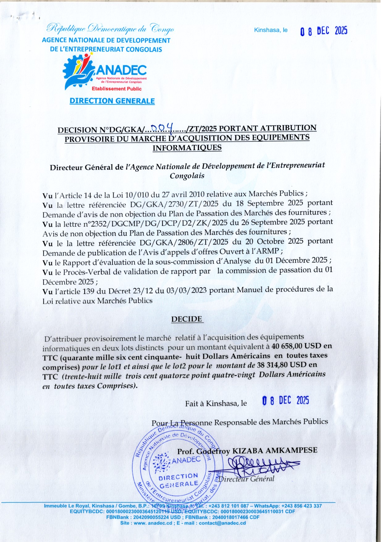 Attribution Provisoire du marché relatif à l’Acquisition des Equipements Informatiques en deux lots distincts en faveur de l’Agence Nationale de Développement de l’Entrepreneuriat Congolais