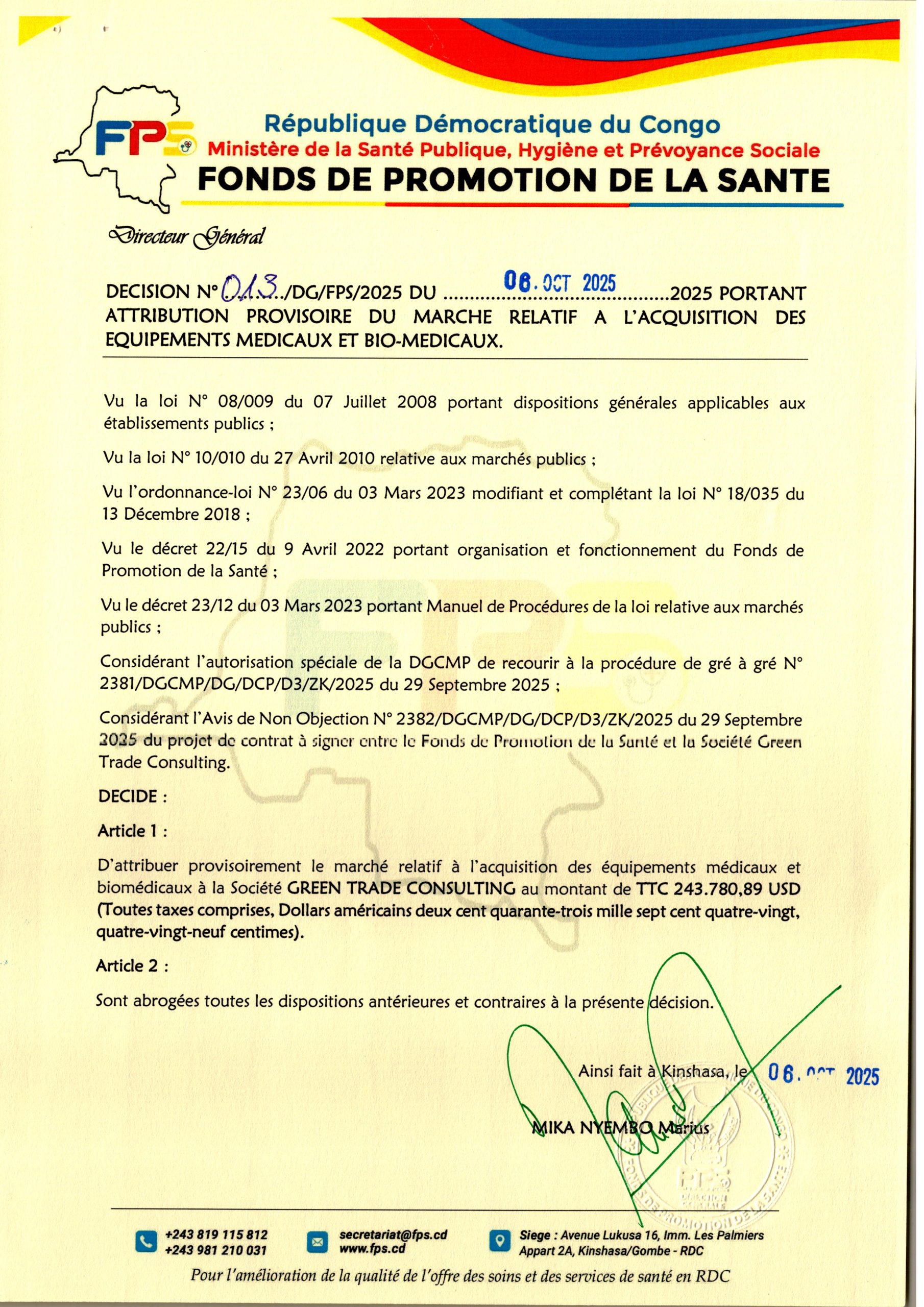 Attribution provisoire du marché relatif à l’acquisition des équipements médicaux et bio-médicaux.