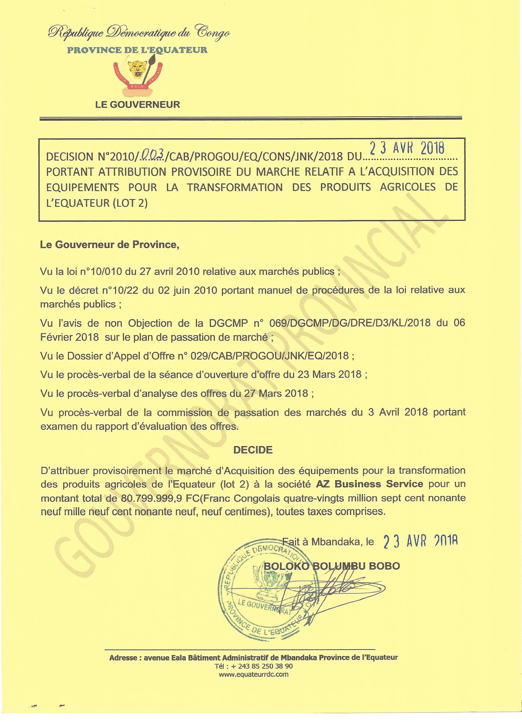 Attribution provisoire du marché relatif à l’acquisition des équipements pour la transformation des produits agricoles de l’équateur (lot 2) à la société AZ BUSINESS SERVICE.