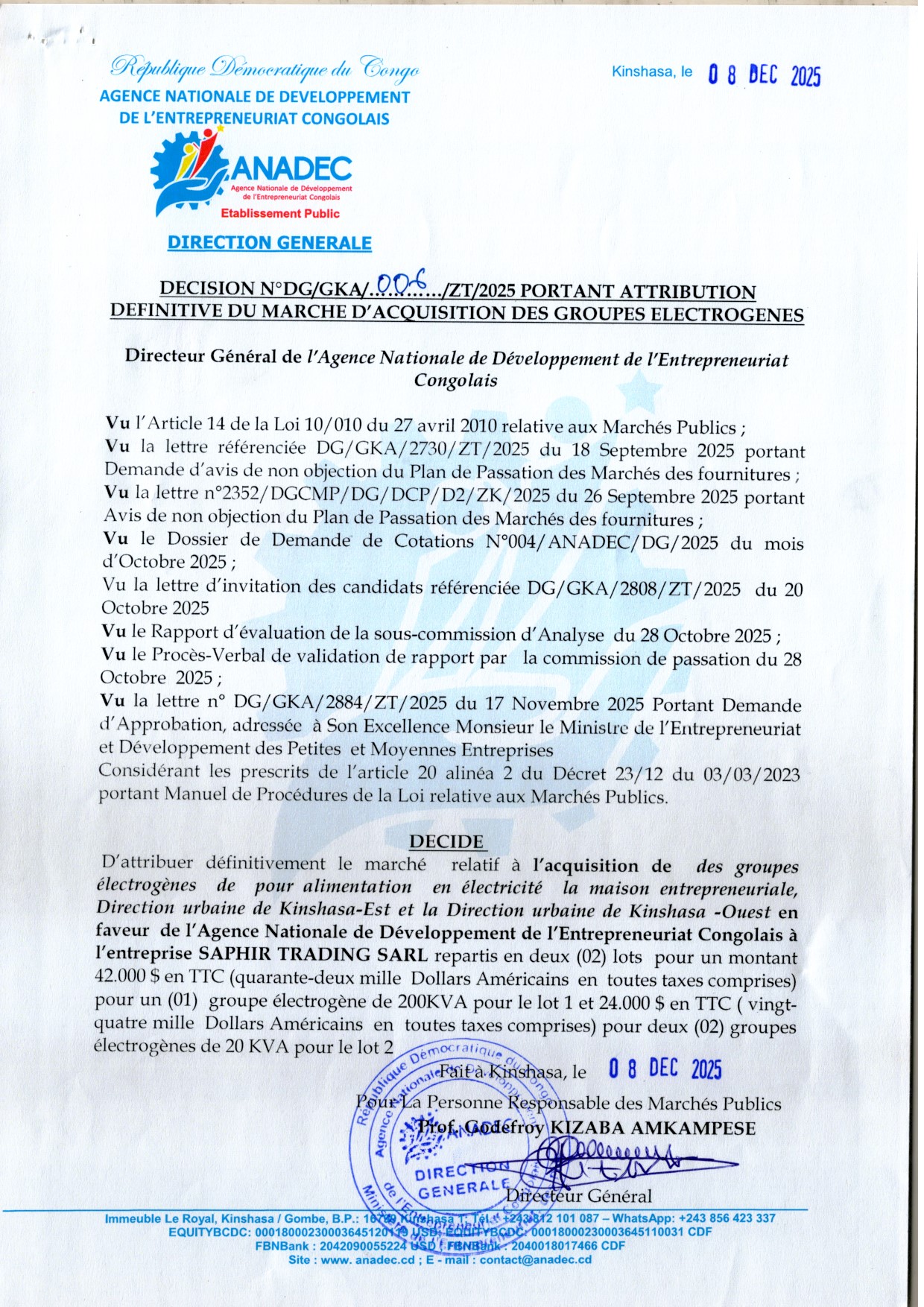 Attribution définitive du marché relatif à l’Acquisition des groupes électrogène pour alimentation en électricité de la maison entrepreneuriale, Direction urbaine de Kinshasa-Est et la Direction urbaine de Kinshasa-Ouest en faveur de ANADEC à l’entreprise SAPHIR TRADING SARL