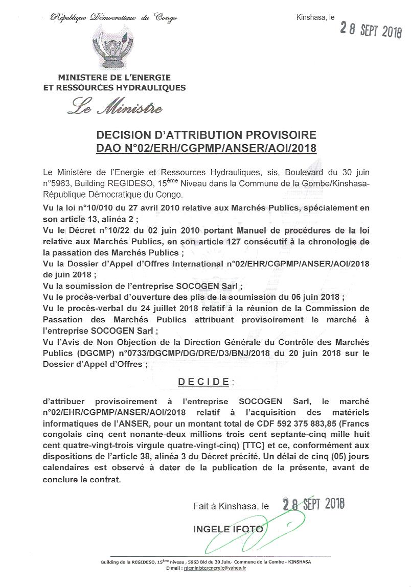 Attribution provisoire du marché relatif à l’acquisition des mobiliers de bureau en faveur de l’anser à l’entreprise SOCOGEN SARL.