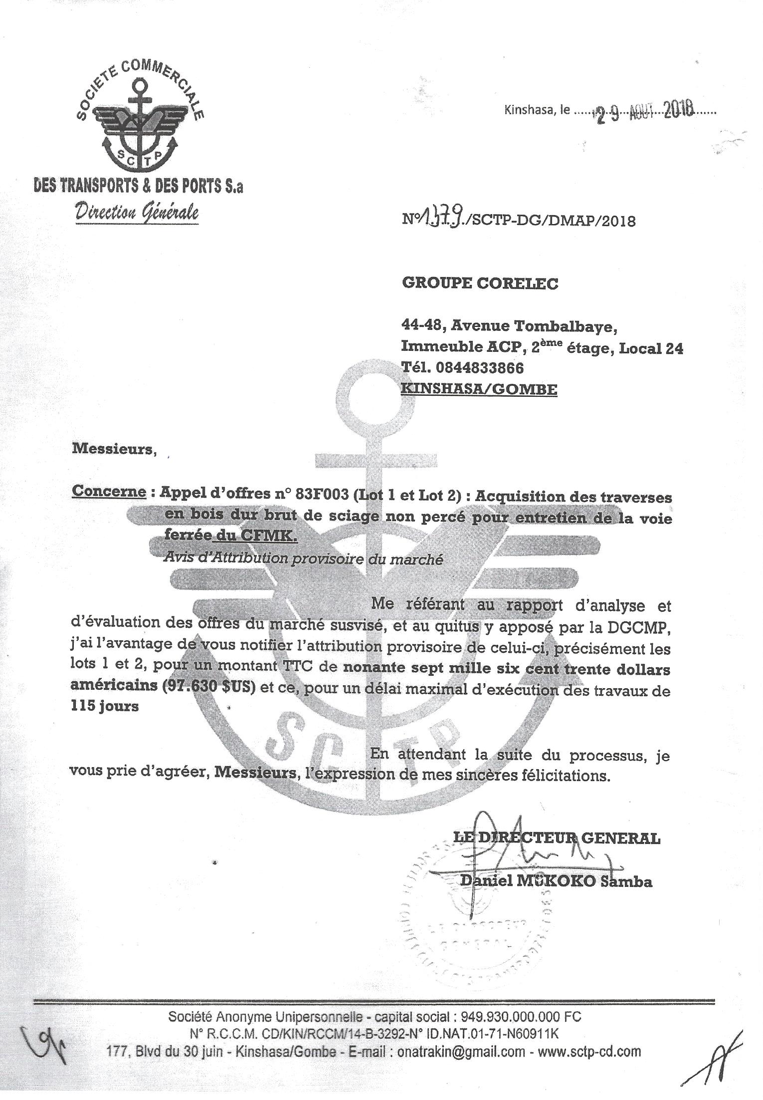 attribution provisoire du marché relatif à l’acquisition des traverses en bois dur brut de sciage non percé pour entretien de la voie ferrée du cfmk à la société GROUPE CORELEC.