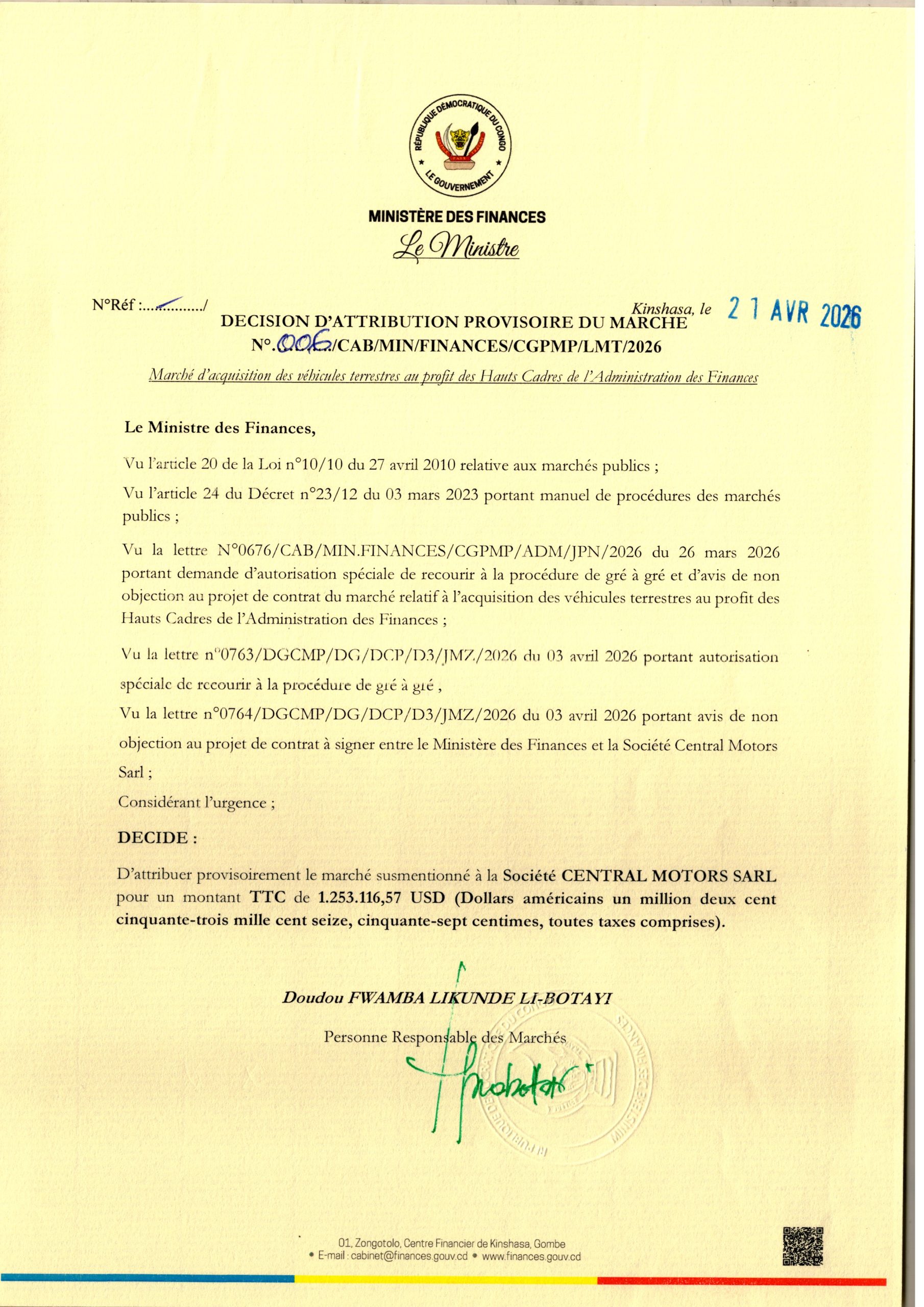 Attribution Provisoire du marché relatif à l’acquisition des véhicules au profit des Hauts Cadres de l’Administration des Finances à la Société CENTRAL MOTORS SARL