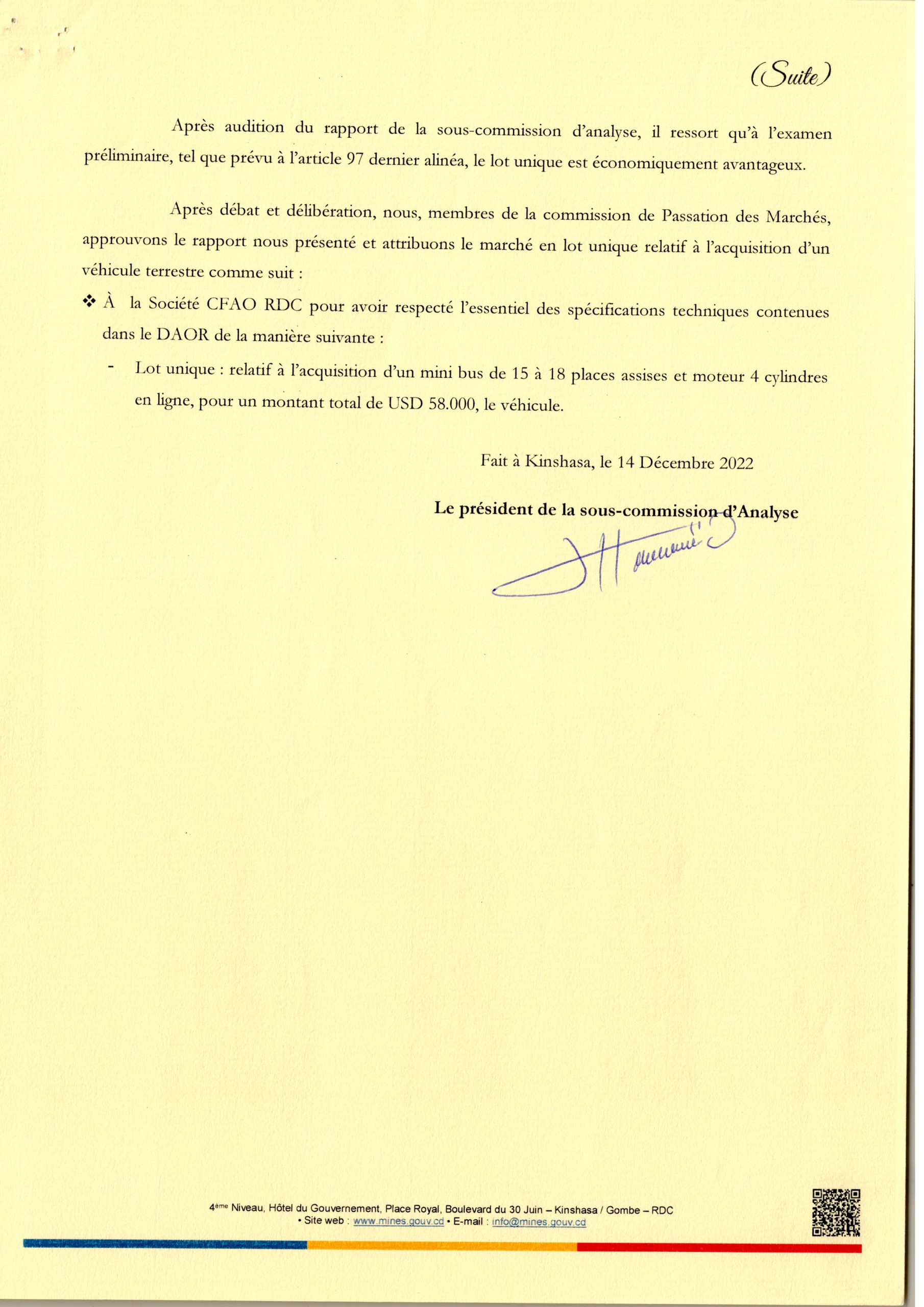 Attribution Provisoire du marché relatif à l’acquisition d’un (01) véhicule terrestre à la société CFAO