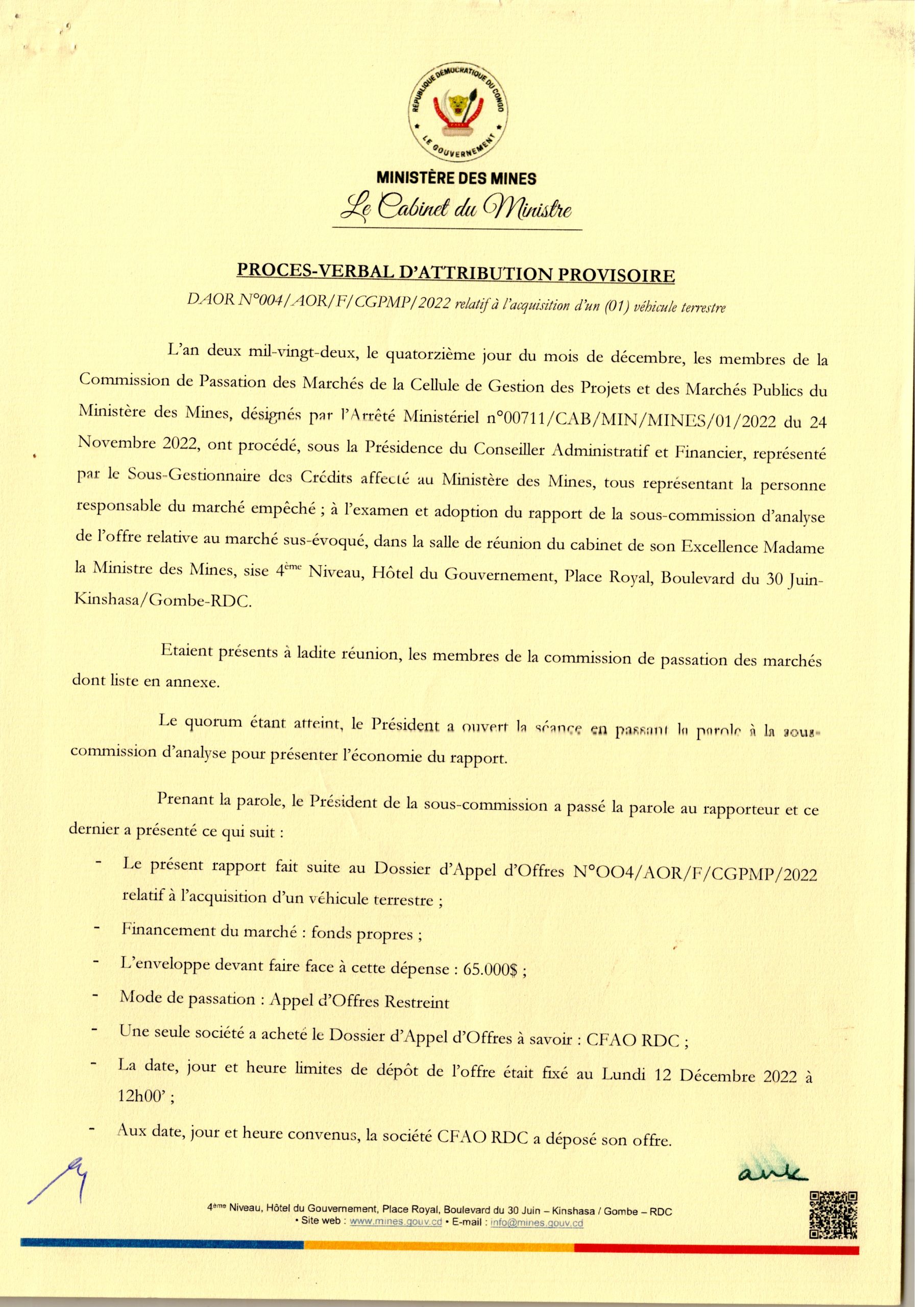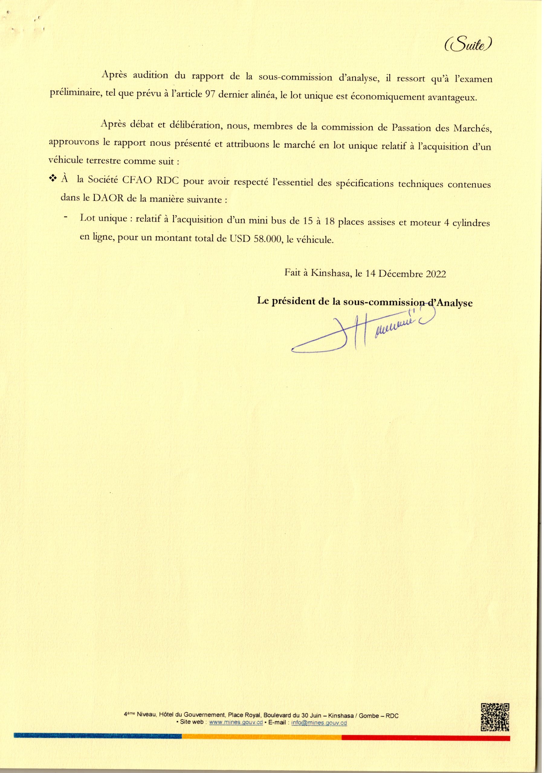 Attribution Provisoire du marché relatif à l’acquisition d’un (01) véhicule terrestre accordée à la société CFAO RDC.