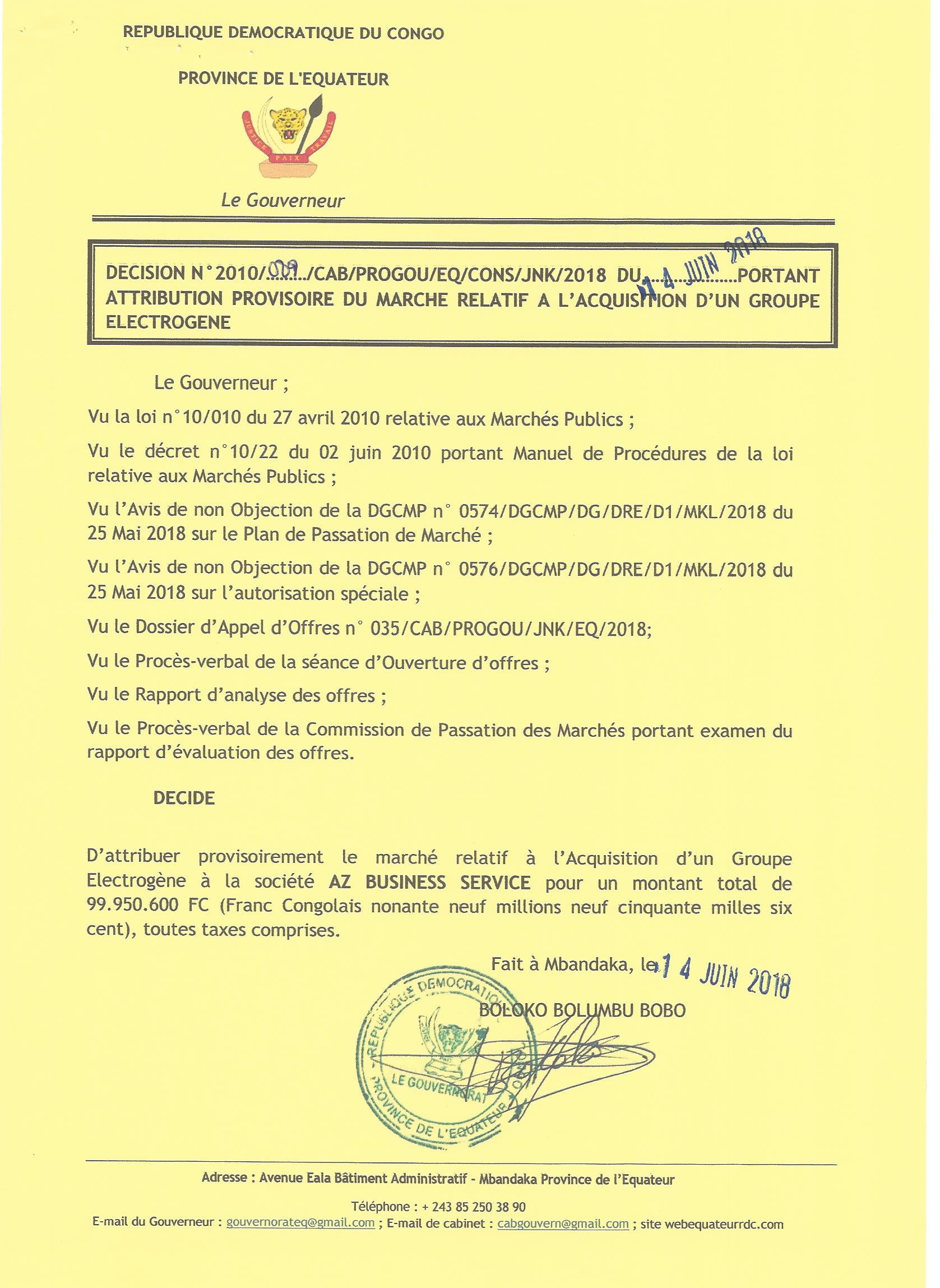 Attribution provisoire du marché relatif à l’acquisition d’un groupe électrogène à la société AZ BUSINESS SERVICE.