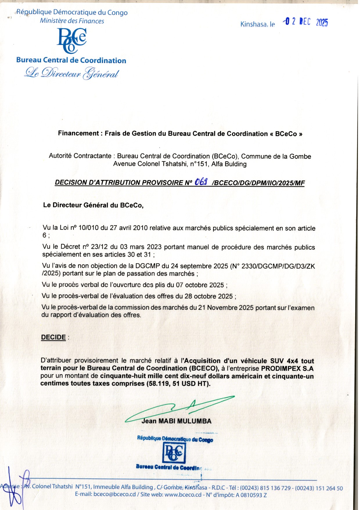 Attribution Provisoire du marché relatif à l’Acquisition d’un véhicule SUV 4X4 tout terrain pour le Bureau Central de Coordination (BCECO), à l’entreprise PRODIMPEX S.A