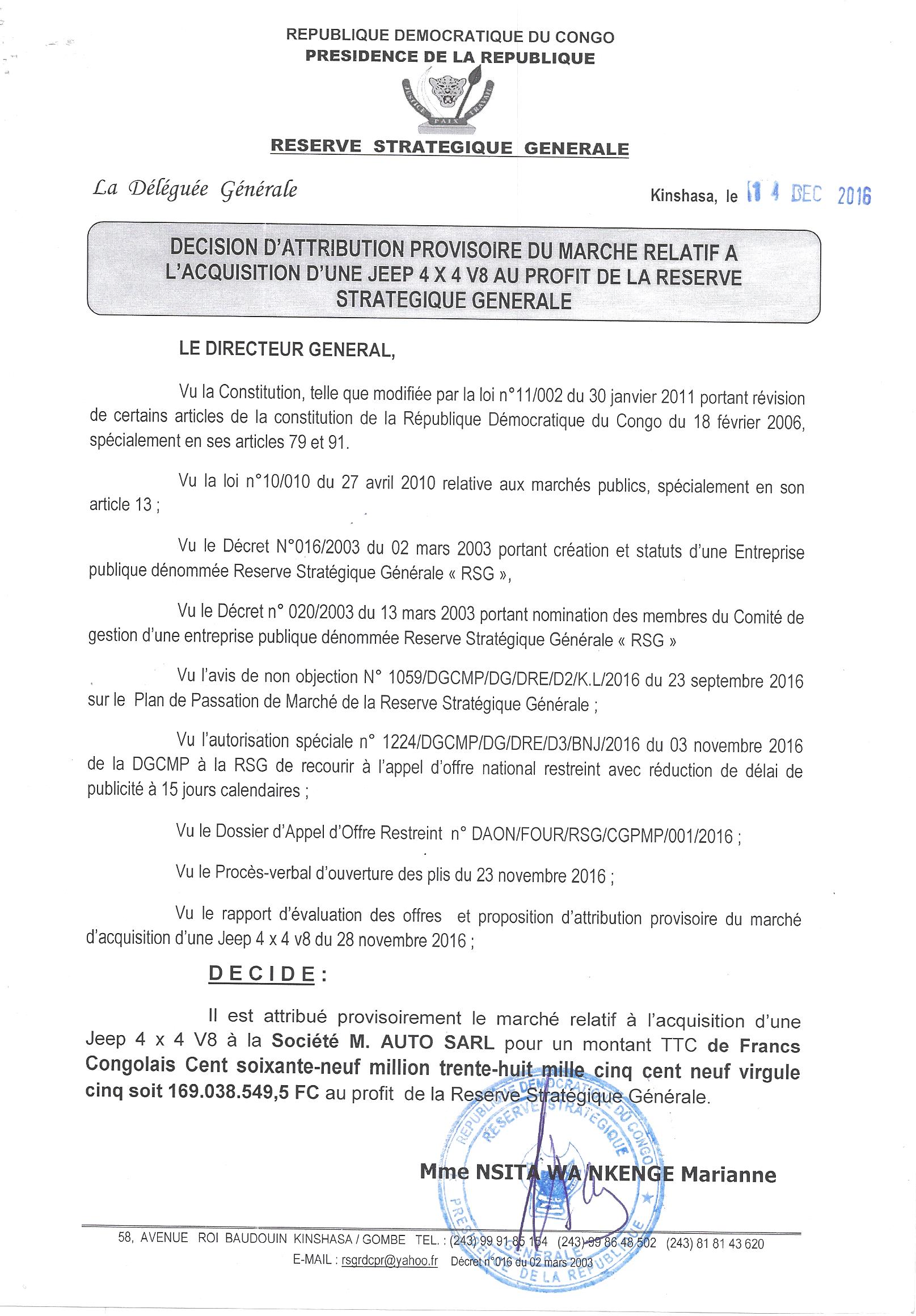 Attribution provisoire du marché relatif à l’acquisition d’une jeep 4×4 v8 au profit de la réserve stratégique générale à LA SOCIÉTÉ M.AUTO SARL.