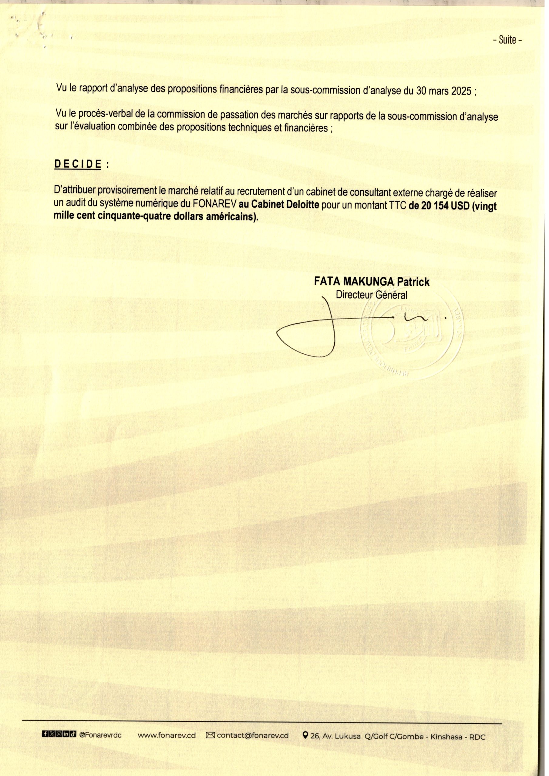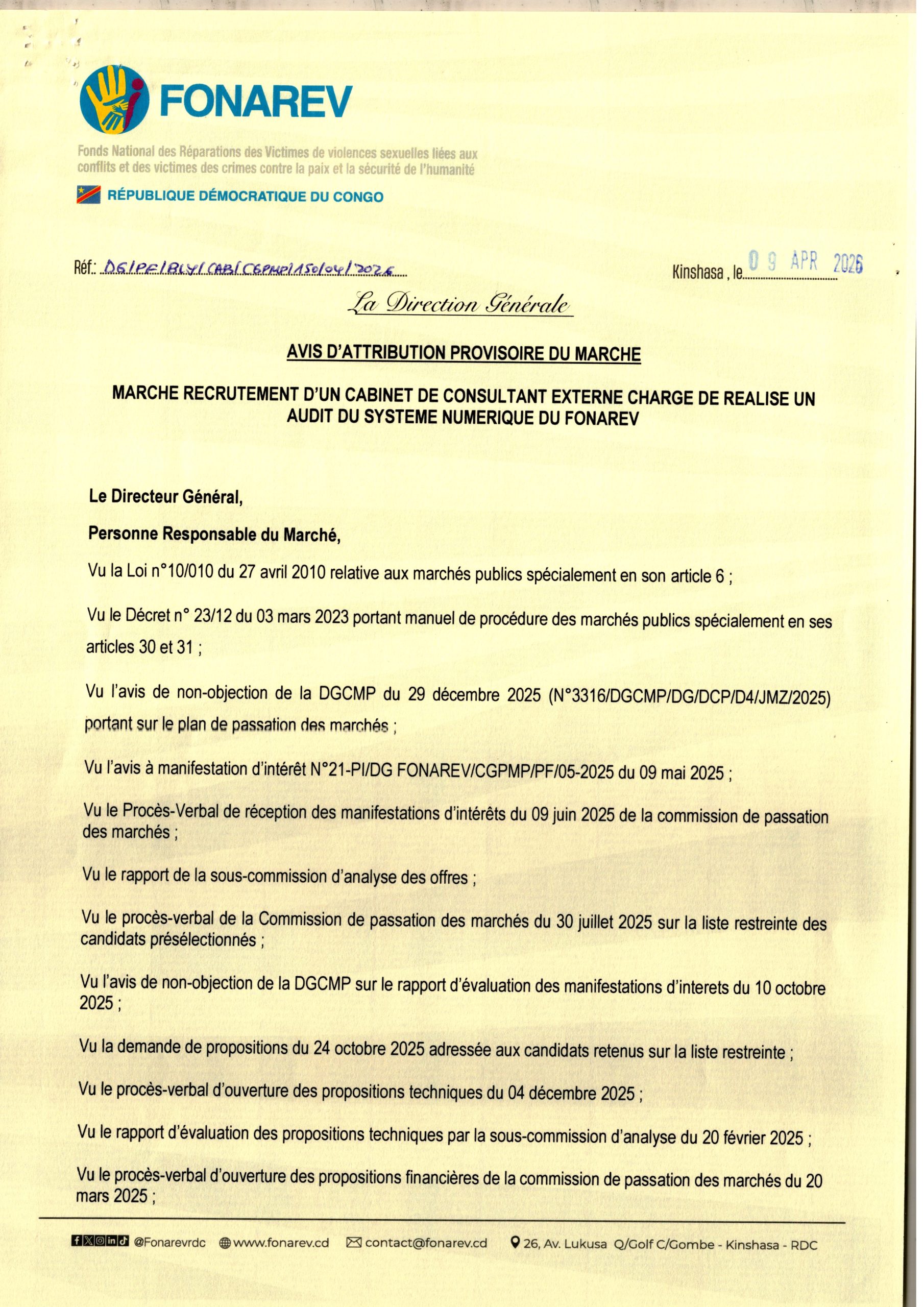 Attribution Provisoire du marché relatif au recrutement d’un Cabinet de Consultant Externe Charge de Réalise un audit du système Numérique du FONAREV
