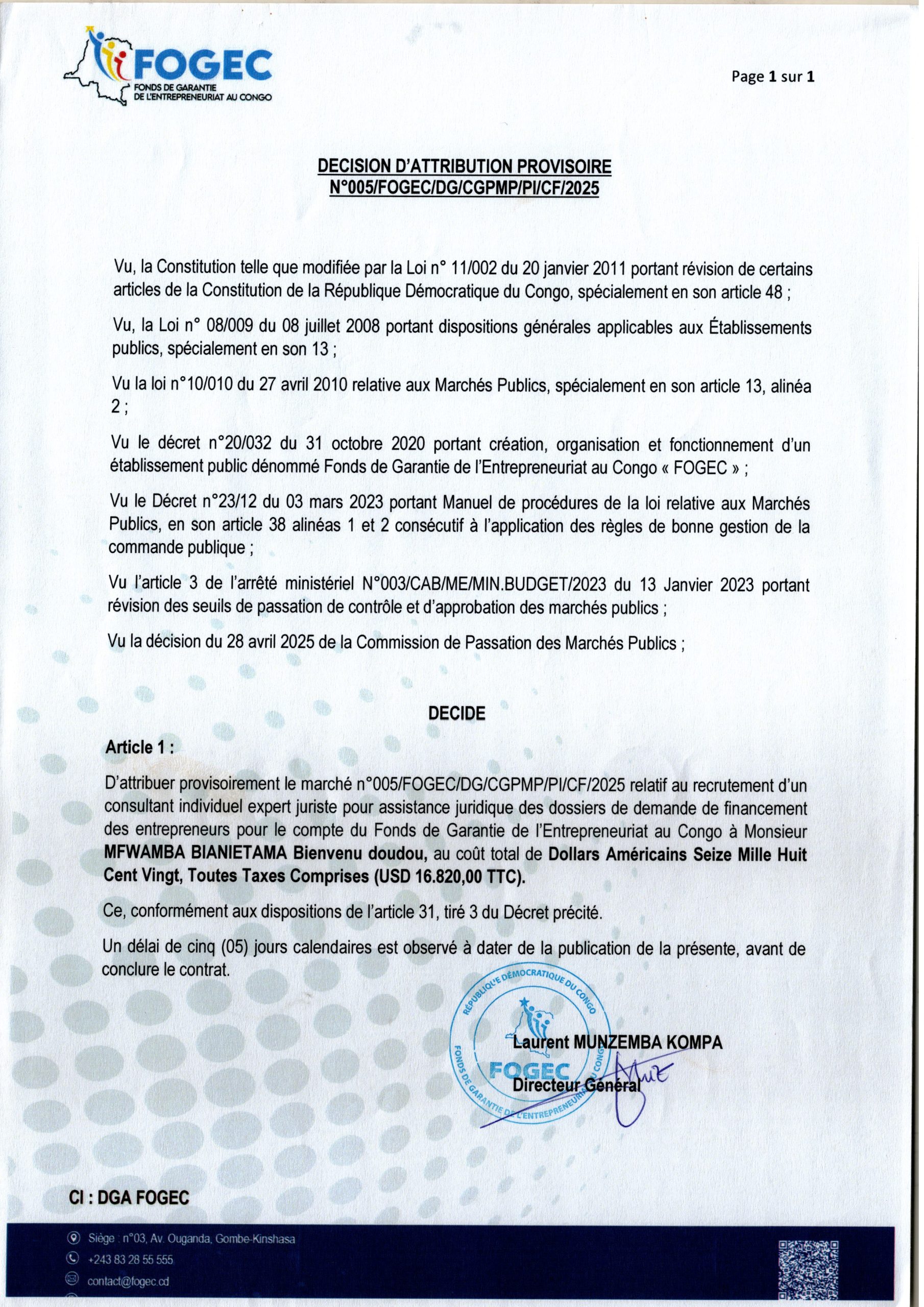 Attribution provisoire du marché relatif au recrutement d’un consultant individuel expert juriste pour assistance juridique de dossiers de demande de financement des entrepreneurs pour le compte du fonds de garantie de l’entrepreneuriat au Congo a monsieur MFWAMBA BIANIETAMA Bienvenu Doudou