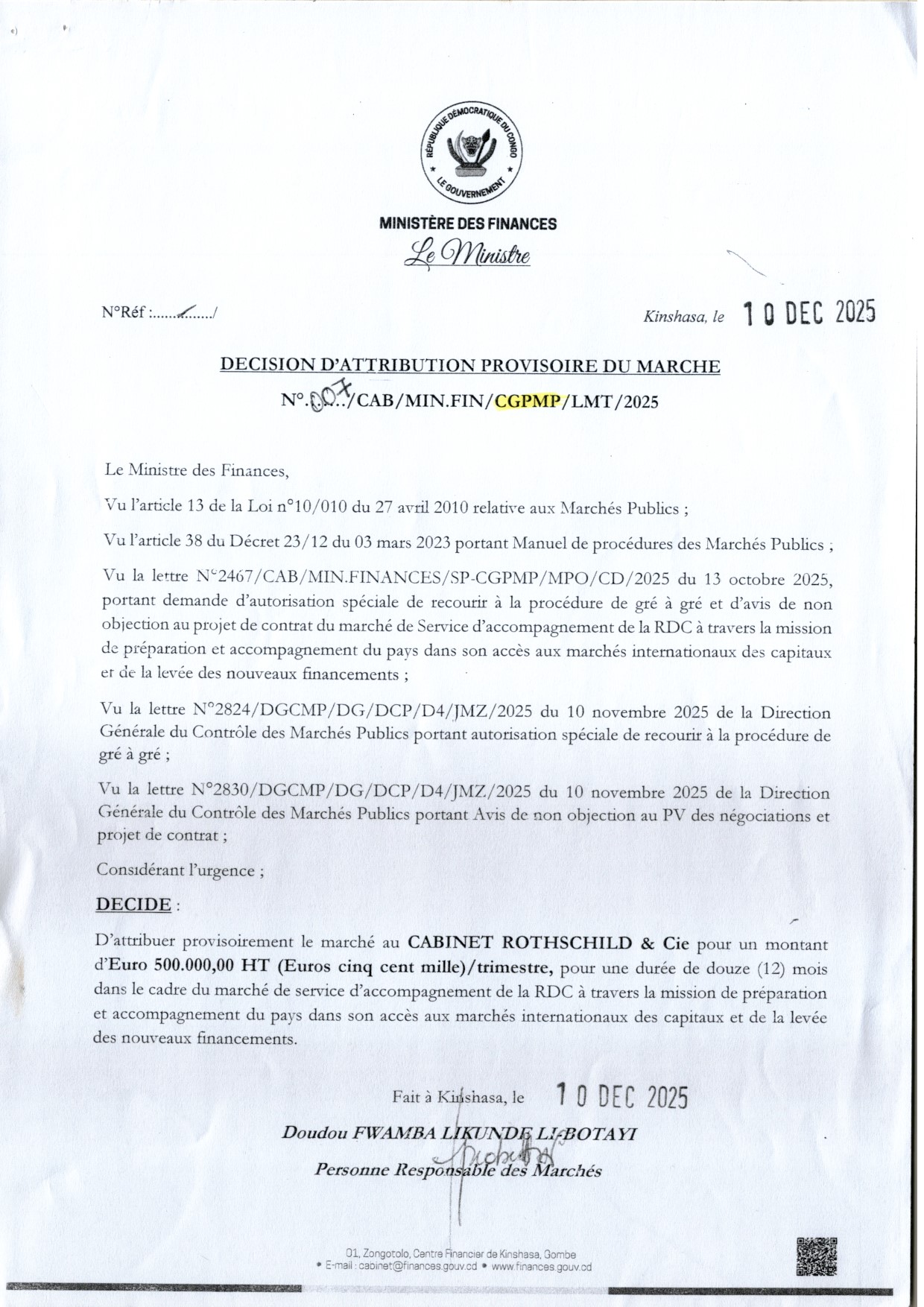 Attribution Provisoire du marché relatif au service d’accompagnement de la RDC à travers la mission de préparation et accompagnement du pays dans son accès aux marchés internationaux des capitaux et de la levée des nouveaux financements au CABINET ROTHSCHILD & Cie