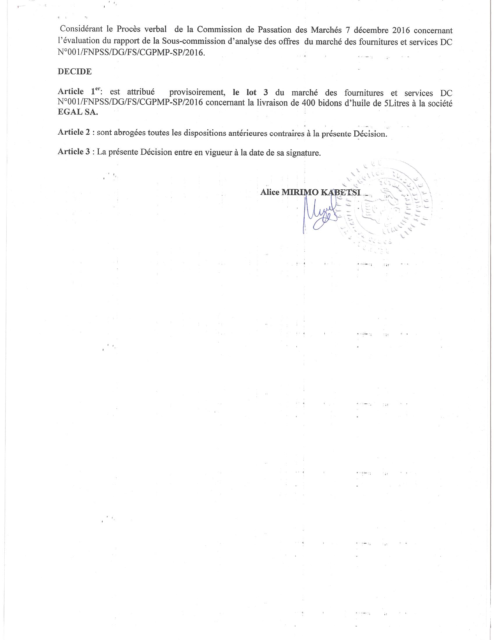 Attribution provisoire du marché relatif aux fournitures et services d’achat des vivres pour les agents et cadres du fnpss pour les festivités de fin de l’année 2016 à la société EGAL sa. Lot 03