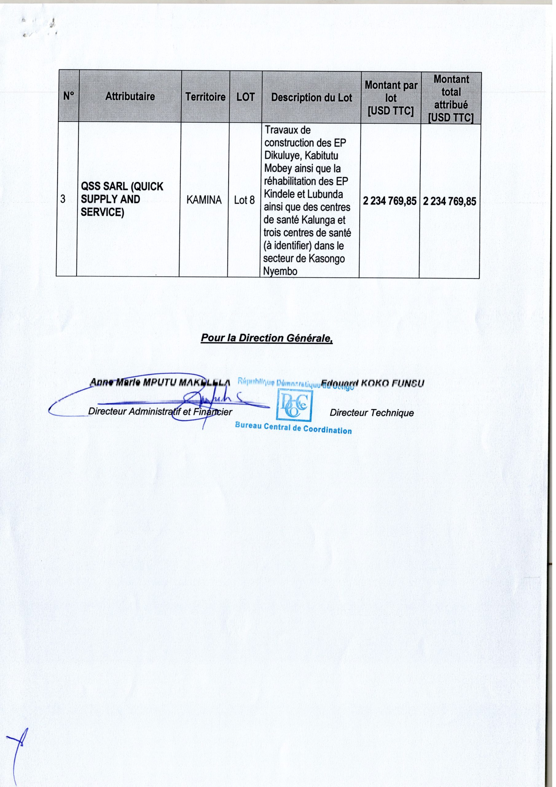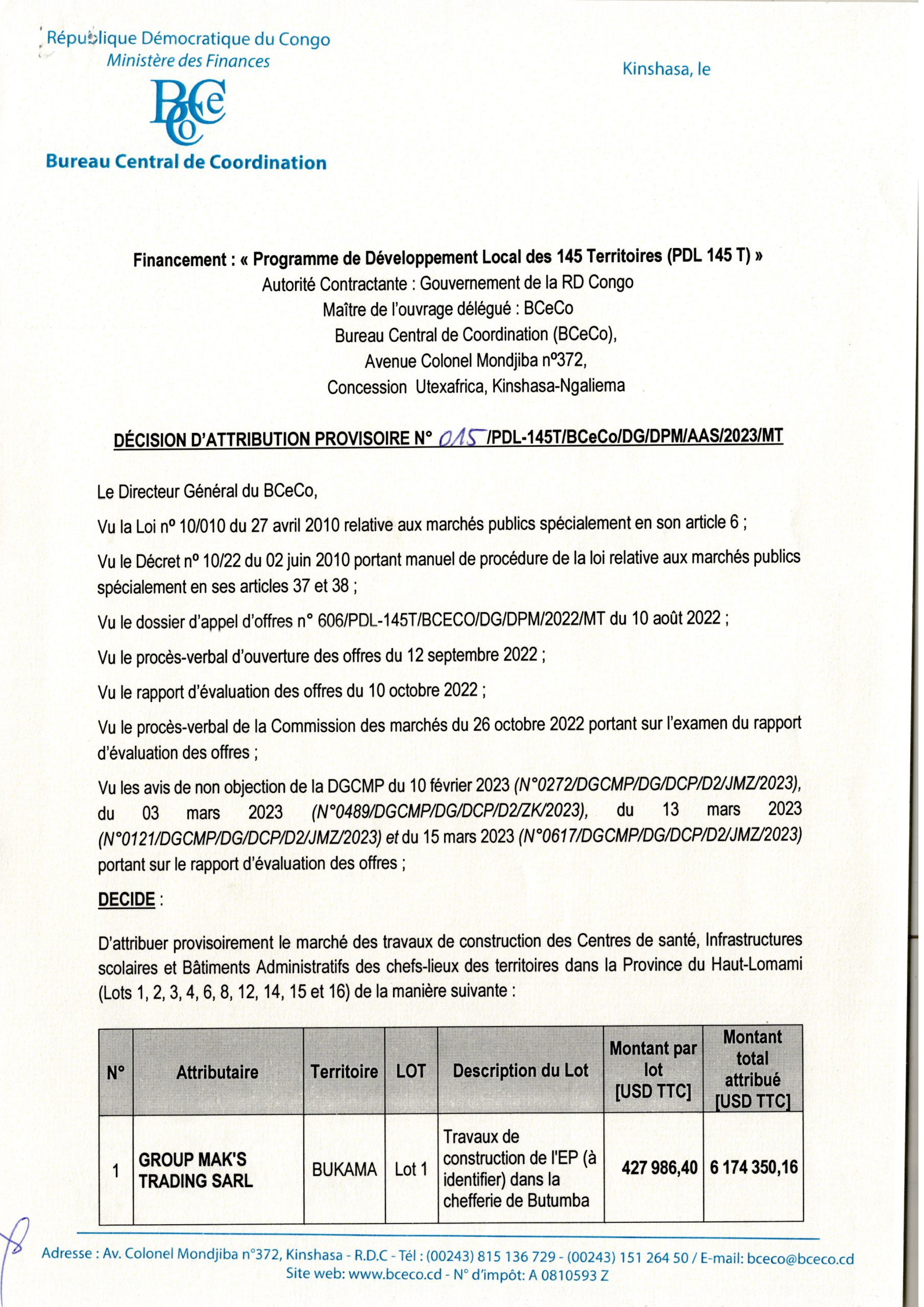 ATTRIBUTION PROVISOIRE DU MARCHE RELATIF AUX TRAVAUX DE CONSTRUCTION DES CENTRES DE SANTE, INFRANSTRUCTURES SCOLAIRES ET BATIMENTS ADMINISTRATIFS DES CHEFS-LIEUX DES TERRITOIRES DANS LA PROVINCE DU HAUT-LOMAMI AUX DIFFERENTES ENTREPRISES REPRISES DANS LE DIT DOCUMENT
