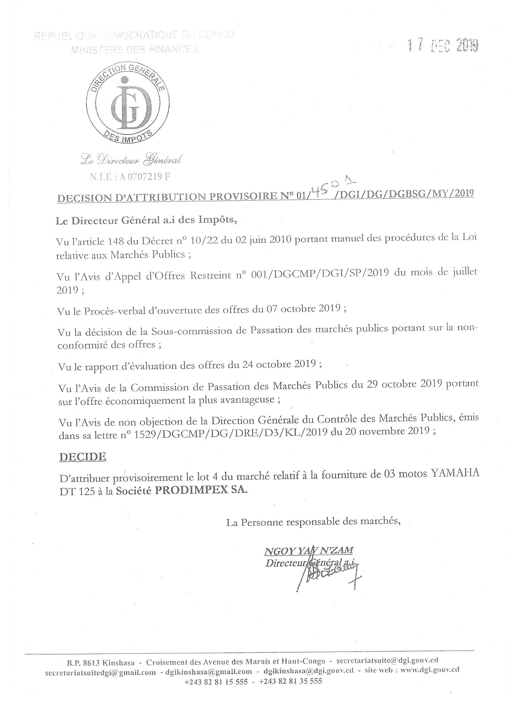 Attribution provisoire en faveur de la société PRODIMPEX sa du marché relatif à la fourniture de 03 motos YAMAHA DT 125.