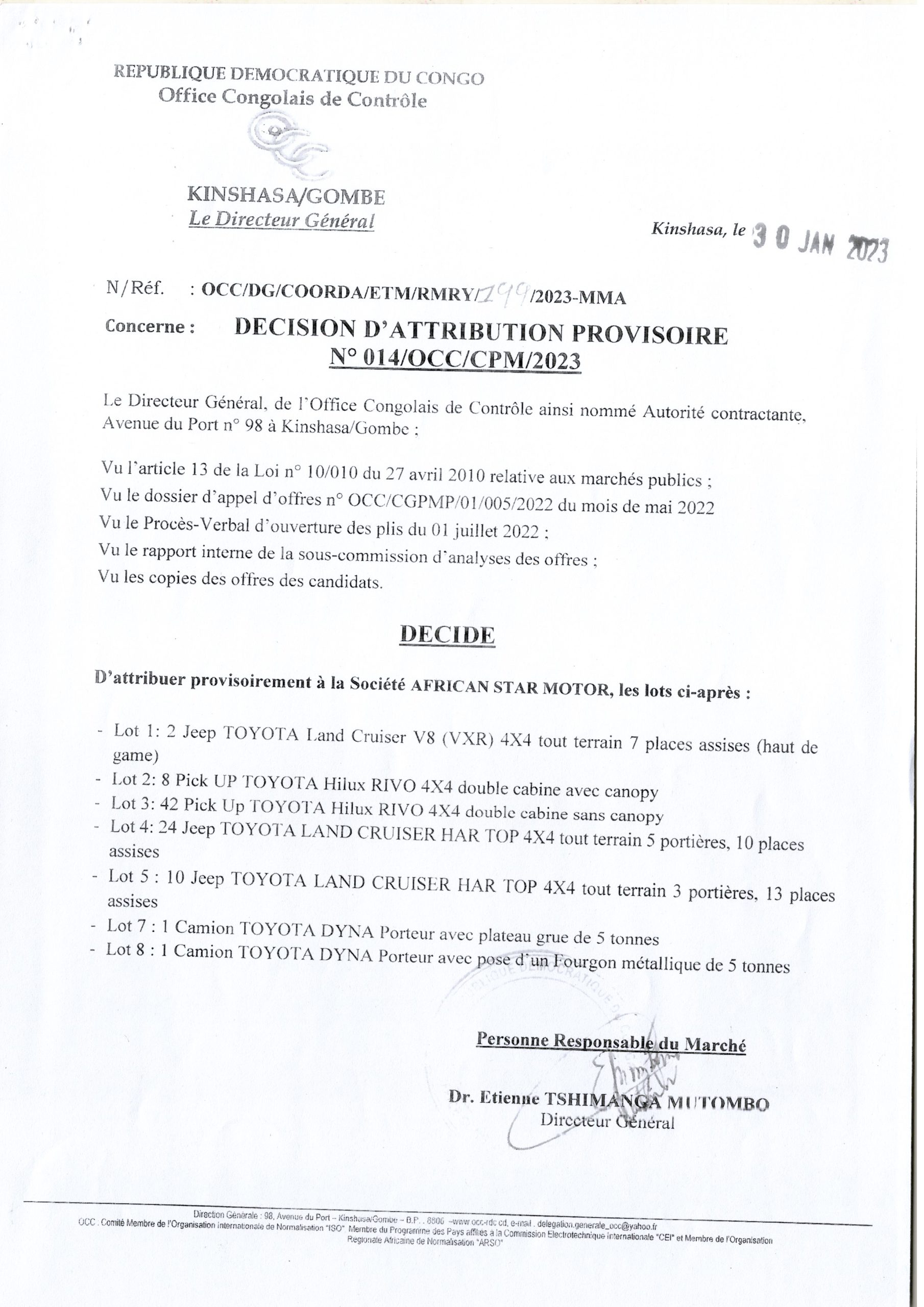 Attribution Provisoire n°014-OCC-CPM-2023 relatif à l’acquisition des matériels automobiles en deux lots : lot 6 et lot 9, accordée à la société AFRICAN STAR MOTOR.
