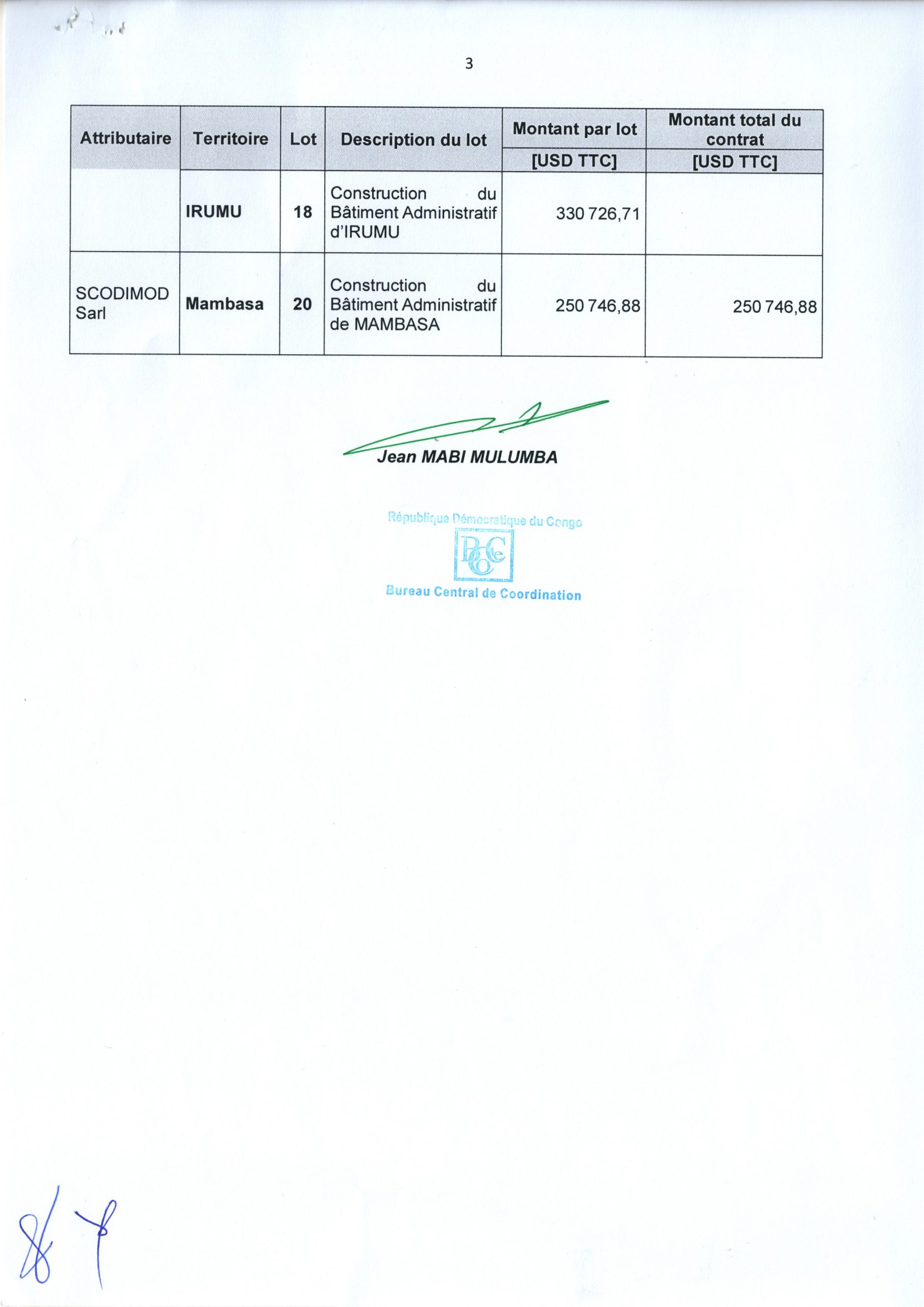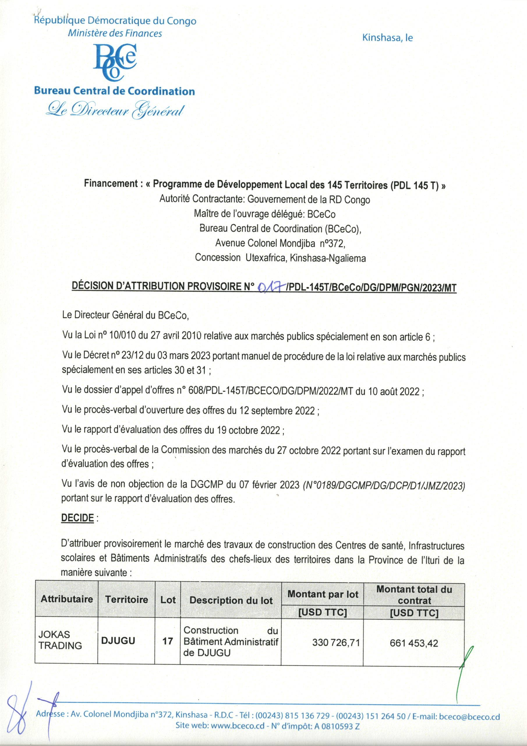 ATTRIBUTION PROVISOIRE RELATIF AU MARCHE DES TRAVAUX DE CONSTRUCTION DES CENTRES DE SANTE, INFRASTRUCTURES SCOLAIRES ET BATIMENTS ADMINISTRATIFS DES CHEFS-LIEUX DES TERRITOIRES DE L’ITURI AUX ENTREPRISES REPRISES SUR LE TABLEAU Y REFERENT