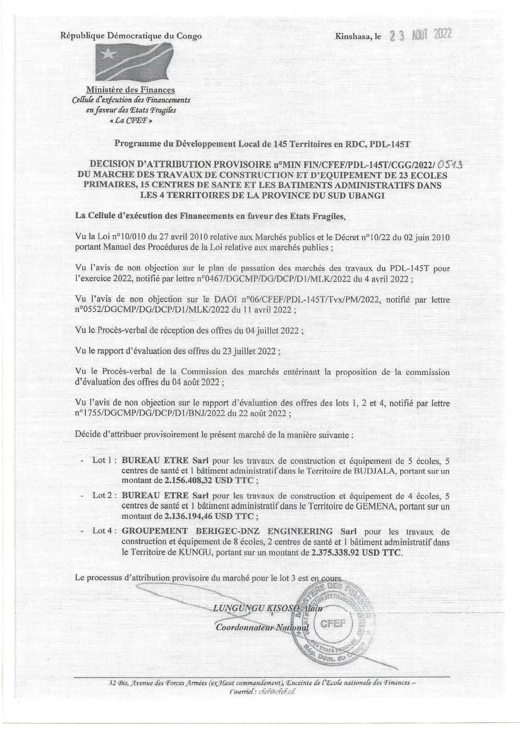 ATTRIBUTION PROVISOIRE RELATIF AUX TRAVAUX DE CONSTRUCTION ET D’EQUIPEMENT DE 23 ECOLES PRIMAIRES 15 CENTRES DE SANTE ET LES BATIMENTS ADMINISTRATIFS DANS LES 4 TERRITOIRES DE LA PROVINCE DU SUD UBANGI.