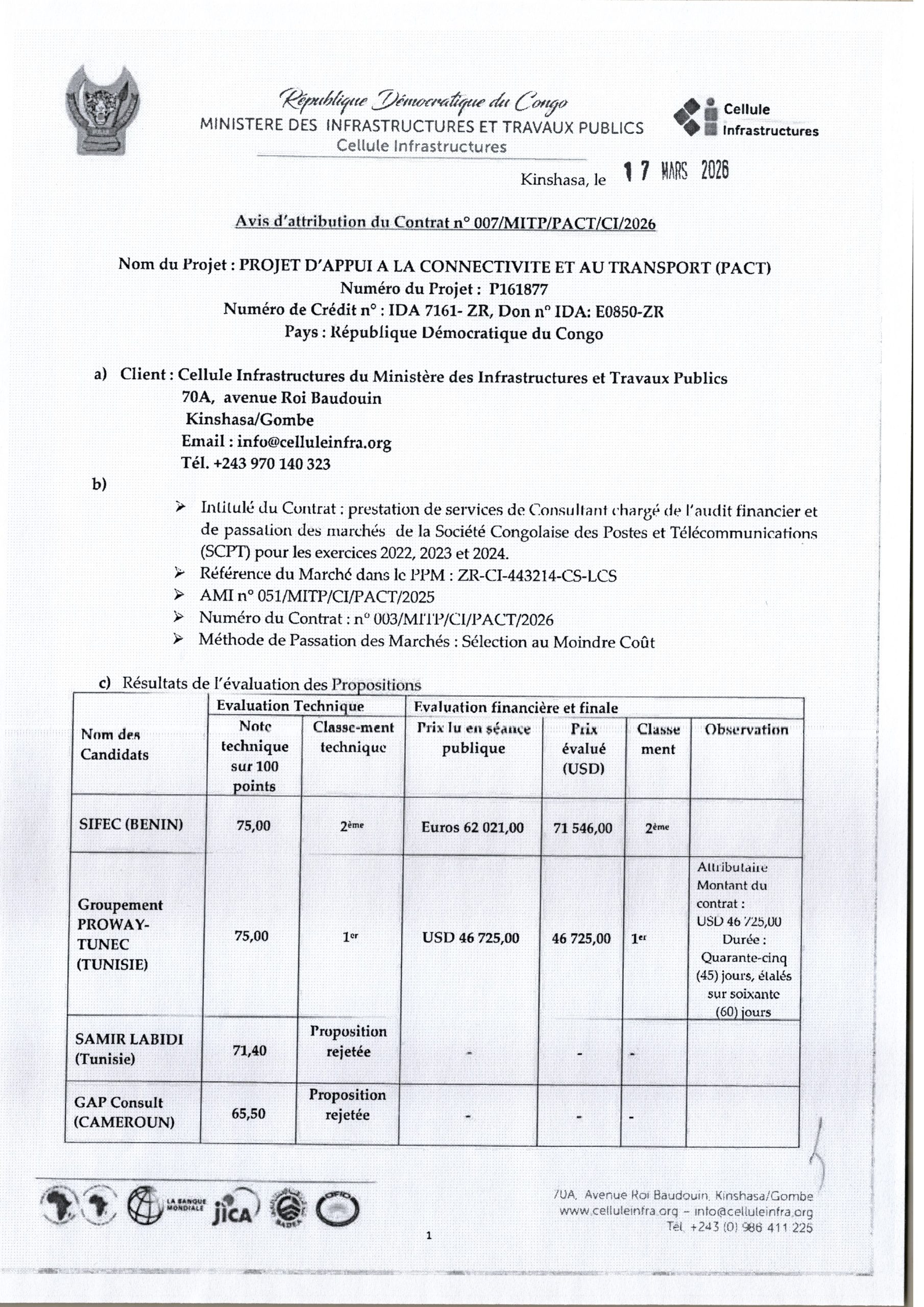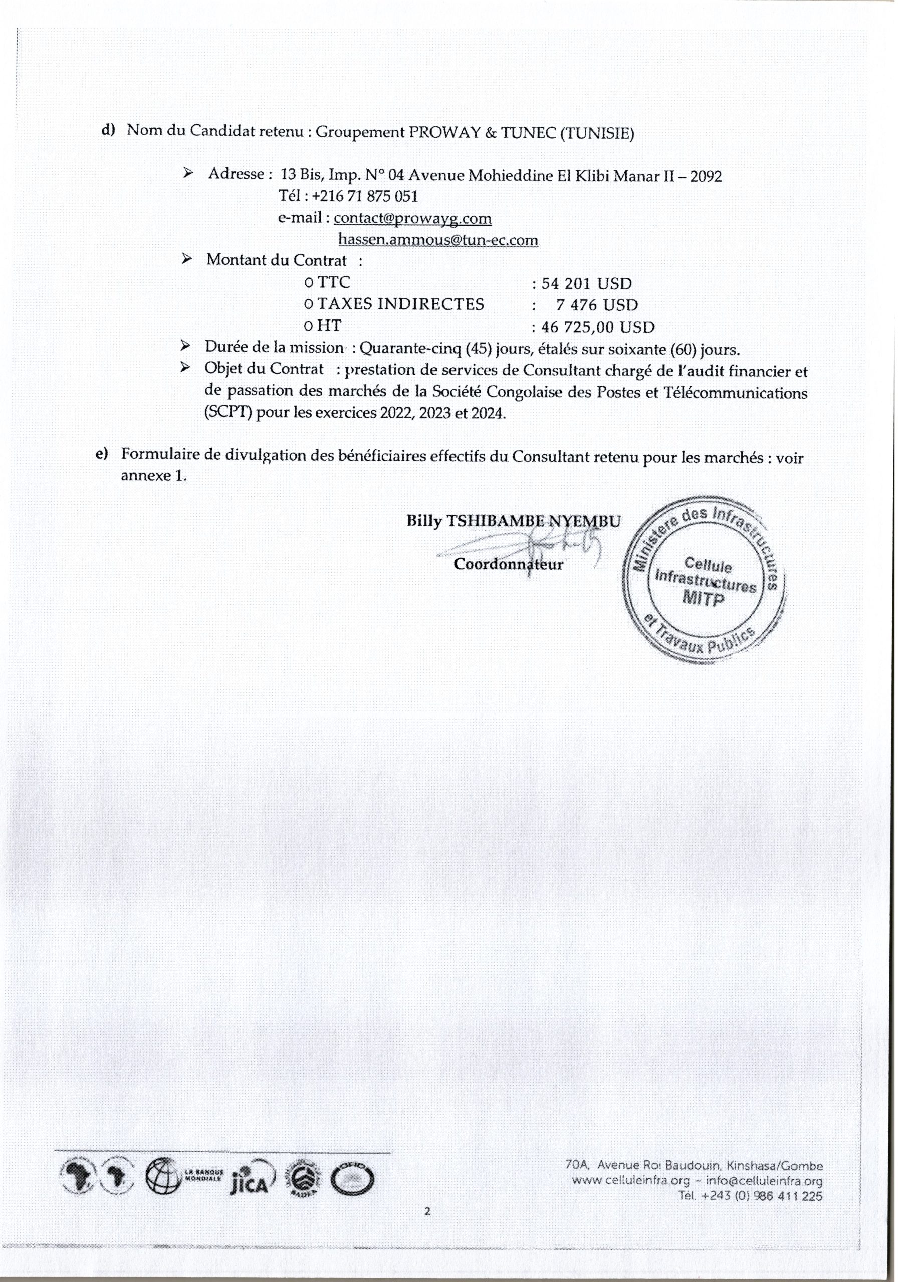 Attrubution provisoire accordée au groupement “PROWAY-TUNEC” relative au marché de prestation de services de consultant chargé de l’audit financier et de passation des marchés de la SCTP pour les exercices 2022, 2023 et 2024.
